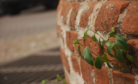 Tường gạch theo thời gian đã nhuốm màu rêu phong