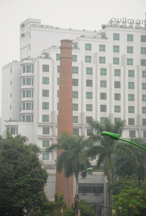 Ống khói của nhà máy gạch còn sót lại như một dấu tích của thời bao cấp bên cạnh khách sạn 5 sao lộng lẫy