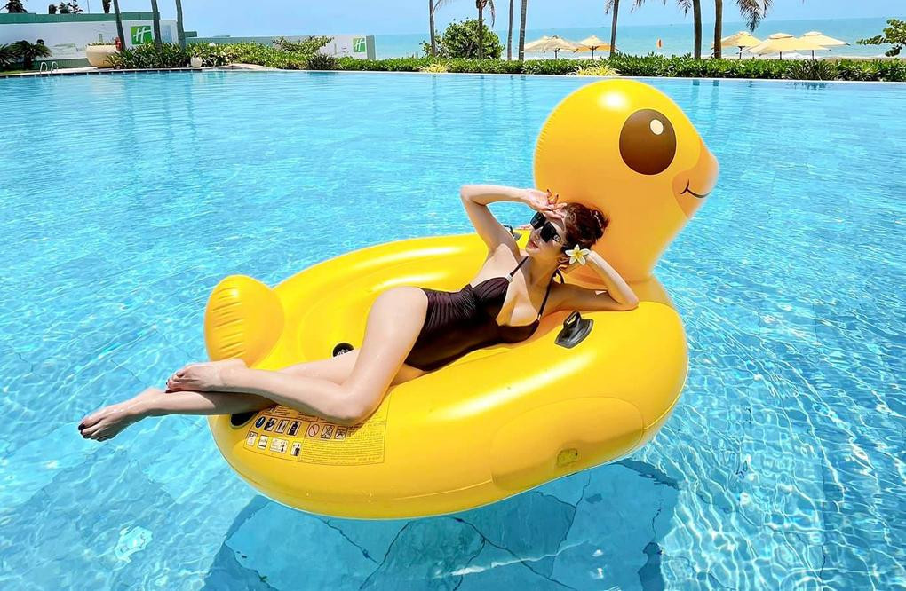 Á hậu Kim Duyên khoe làn da nâu bóng đầy khỏe mạnh, vóc dáng săn chắc không chút mỡ thừa.