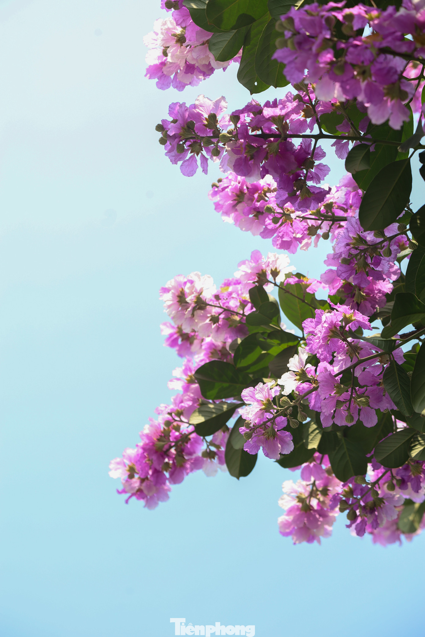 | Những bông hoa bằng lăng nở thành từng chùm tím rực rỡ nổi bật trên nền trời xanh. |