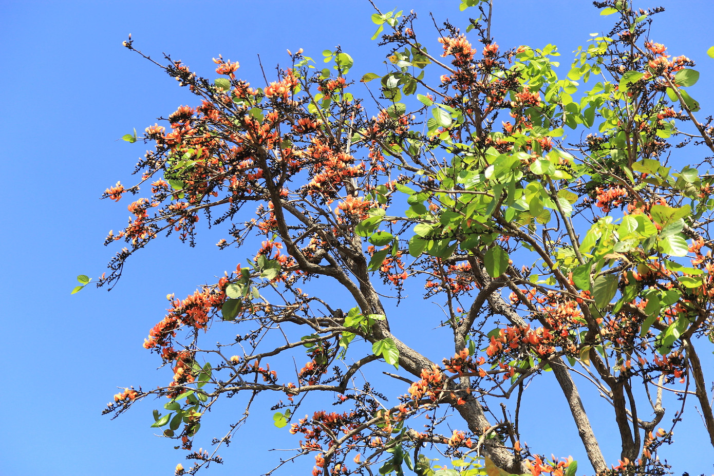 Lá cây mlah rụng xuống để lộ những chùm hoa đỏ rực