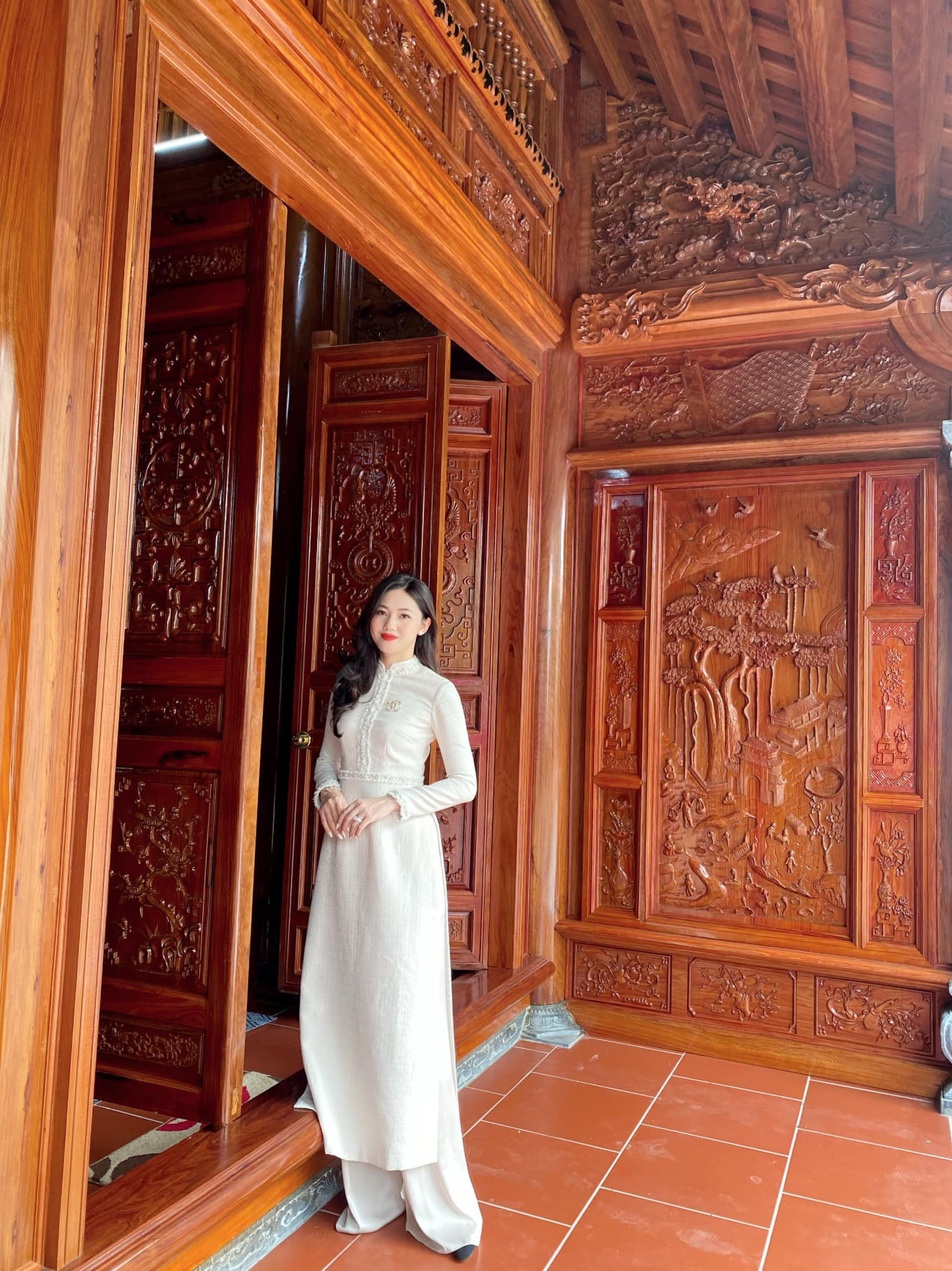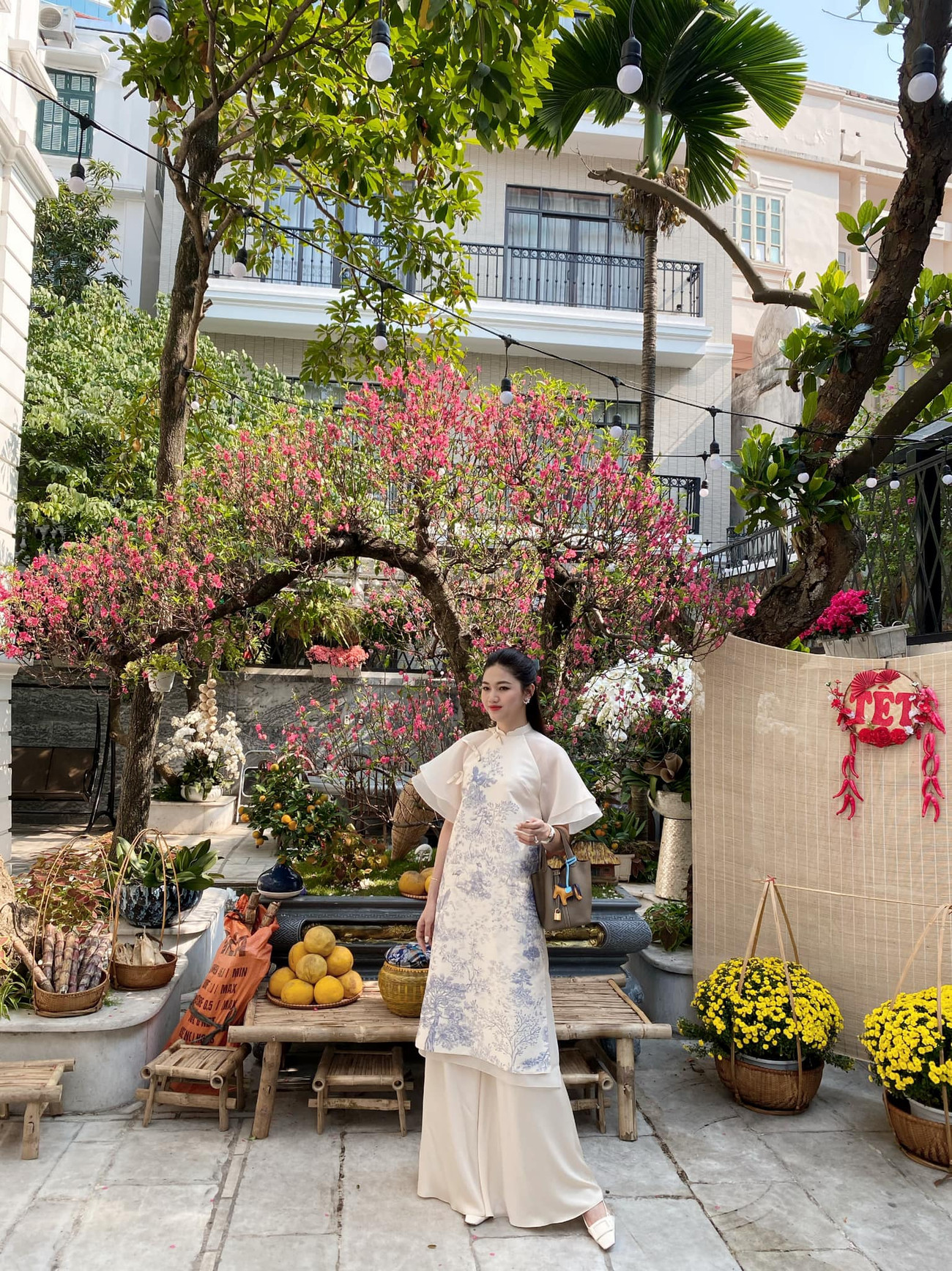 Áo dài gam màu trắng duyên dáng là trang phục được Á hậu Thanh Tú ưu ái trong dịp Tết năm nay.