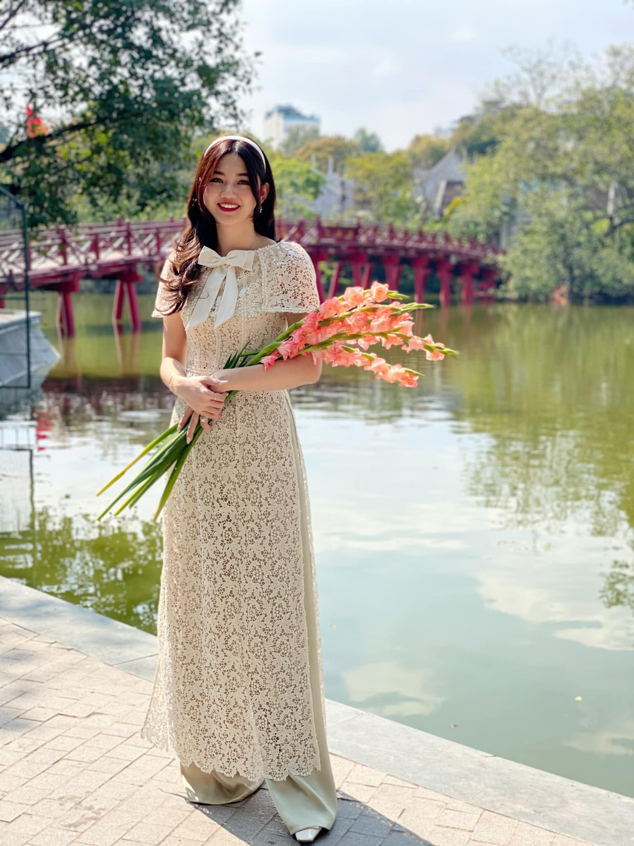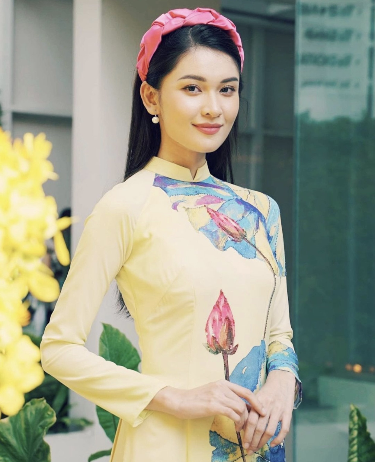 Á hậu Thùy Dung nền nã, xinh đẹp với trang phục áo dài khăn đòng in họa tiết hoa sen.