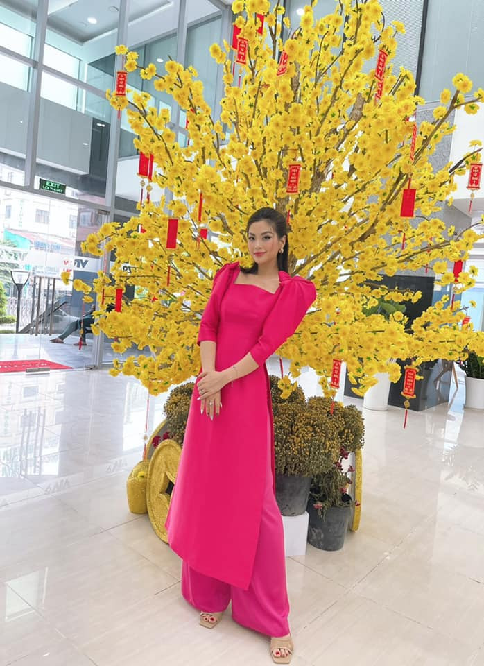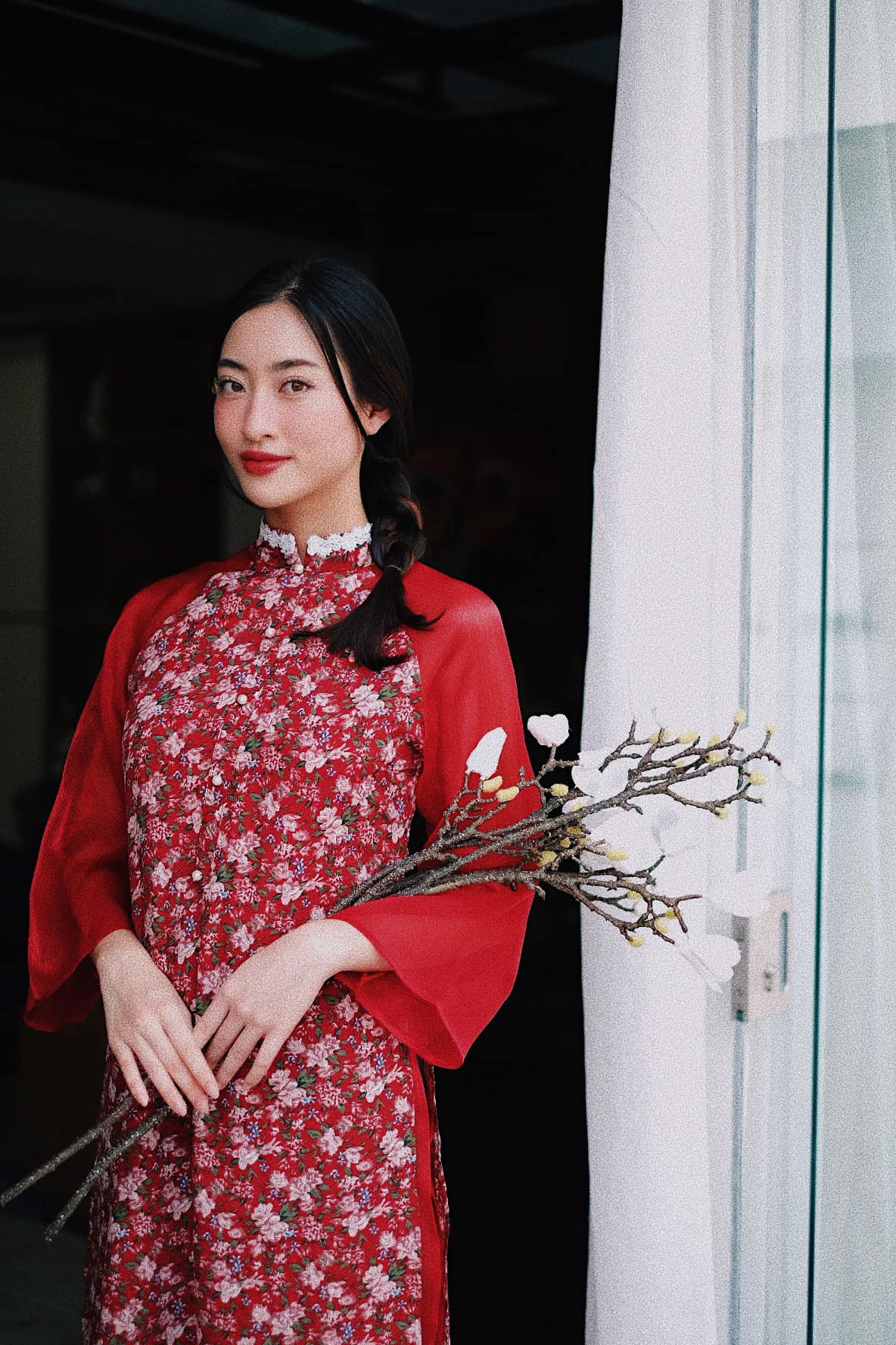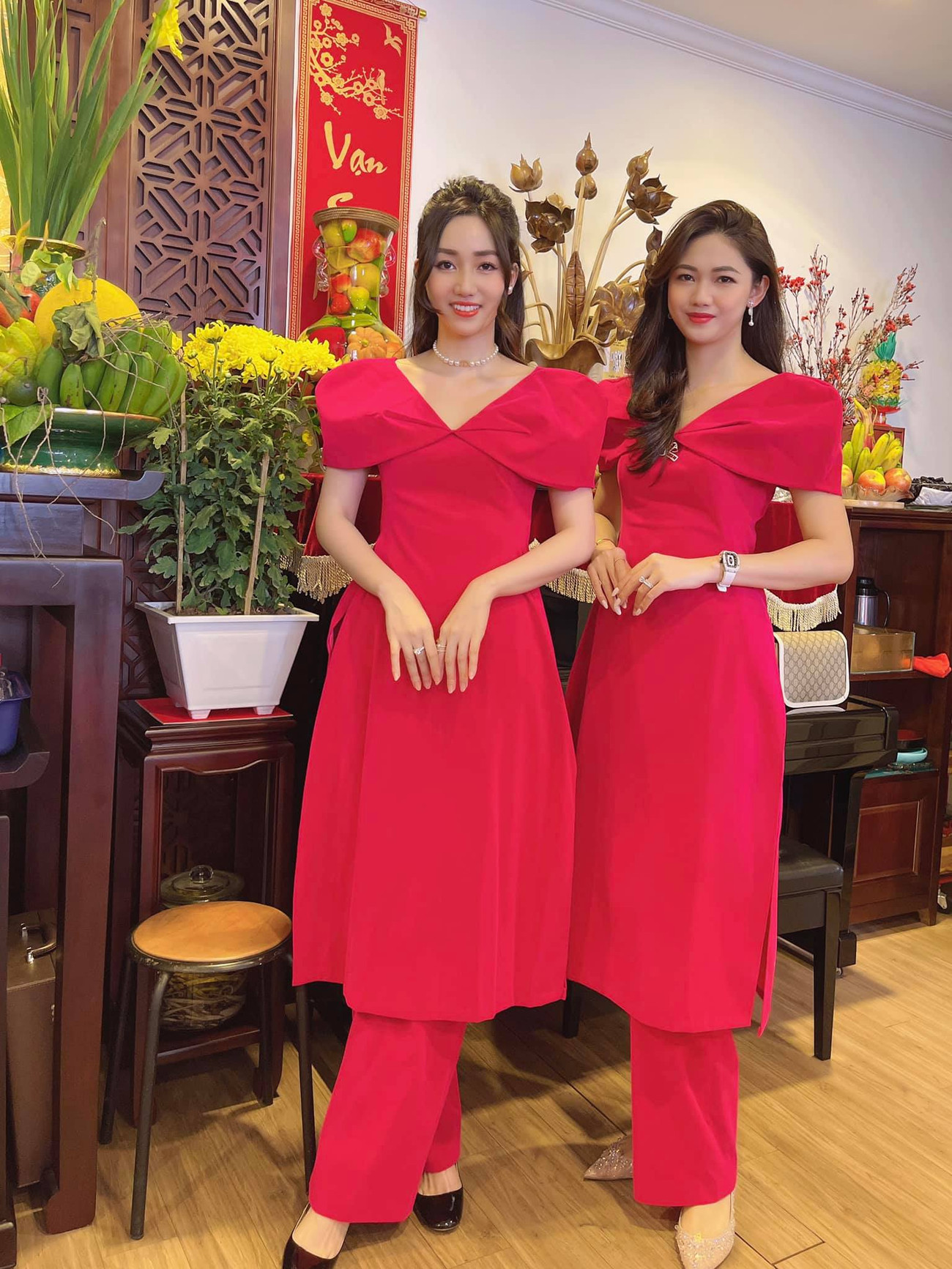 Cô cũng nổi bật khi diện áo dài đôi màu đỏ rực rỡ bên chị gái - Á hậu Trà My khi đi chúc Tết.