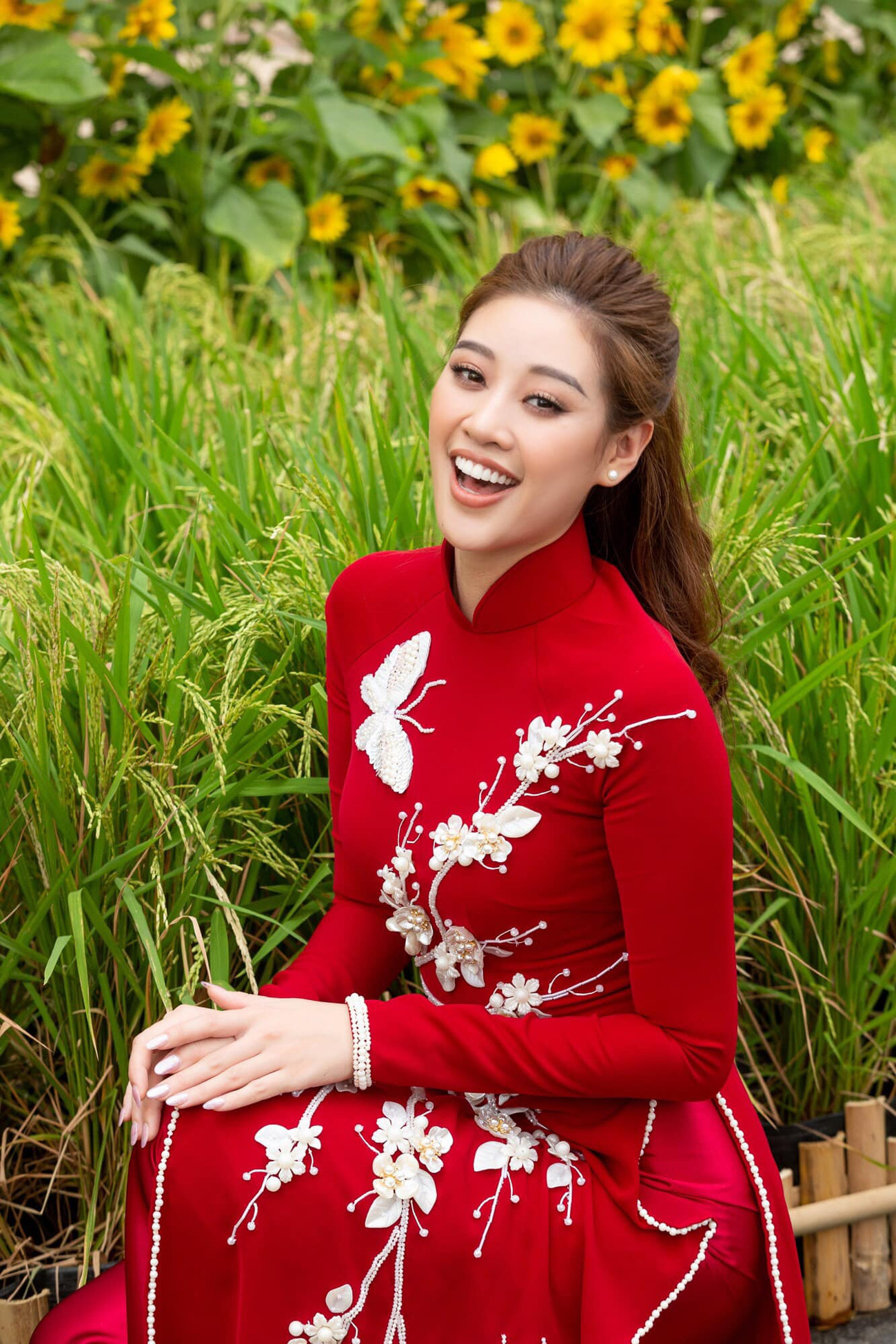 Hoa hậu Khánh Vân diện áo dài kiểu đáng truyền thống thêu họa tiết hoa nổi bật dọc thân áo.