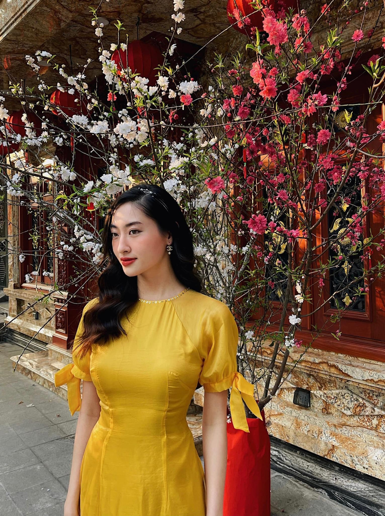 Lương Thùy Linh là một trong những nàng hậu chăm chỉ diện áo dài nhất trong dịp tết Nguyên Đán vừa qua. Cả ba ngày Tết, Lương Thùy Linh đều có những bộ áo dài nền nã, đẹp mắt. Bộ áo dài màu mỡ gà mà cô diện vào ngày mùng 1 Tết vừa tươi trẻ vừa nổi bật.