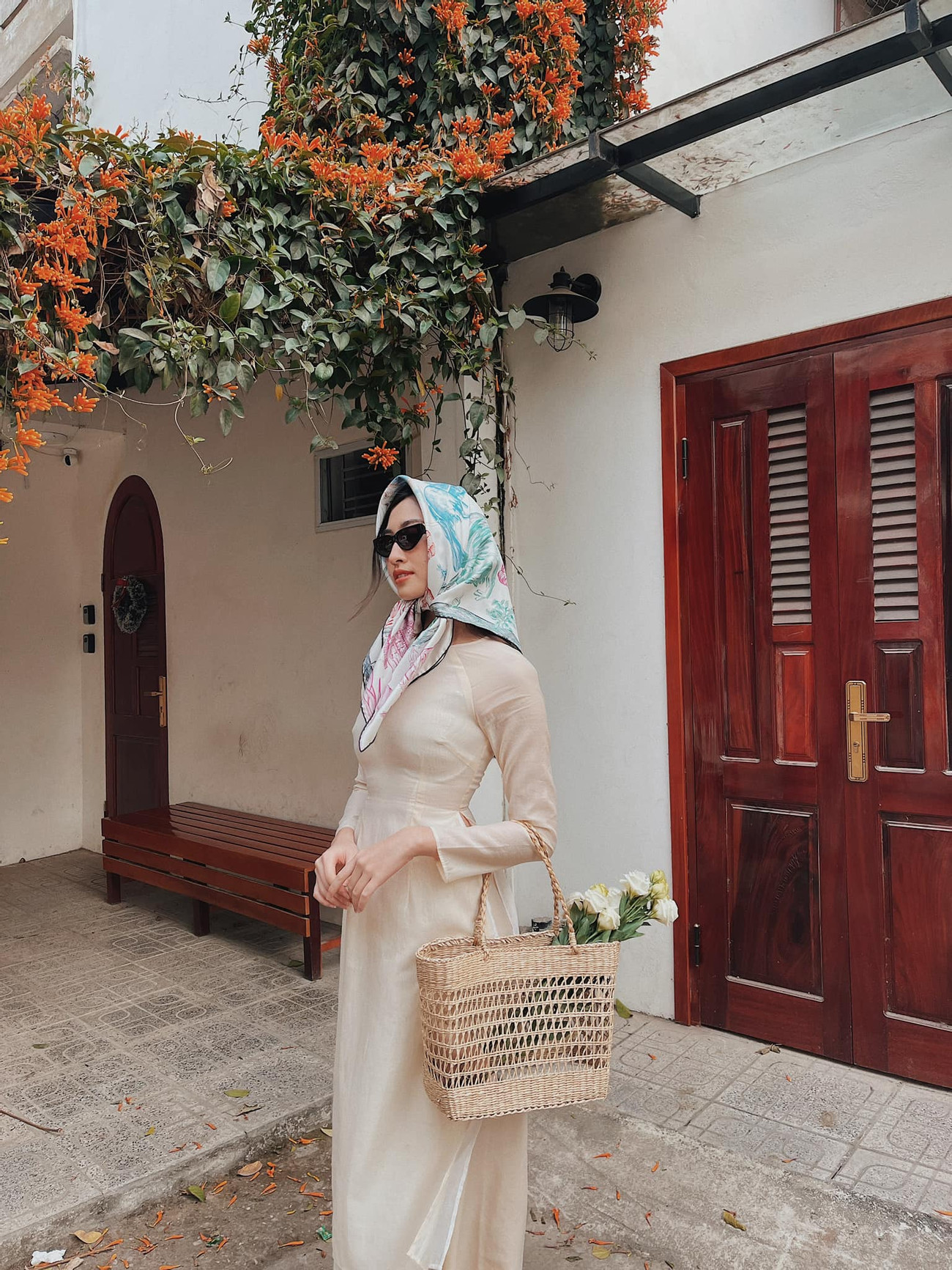Ngày mùng 2 Tết Lương Thùy Linh hóa thân thành cô ba Sài Gòn với áo dài cách tân màu be, kết hợp cùng những phụ kiện sành điệu như chiếc làn cói, kính mắt mèo và khăn đội đầu.