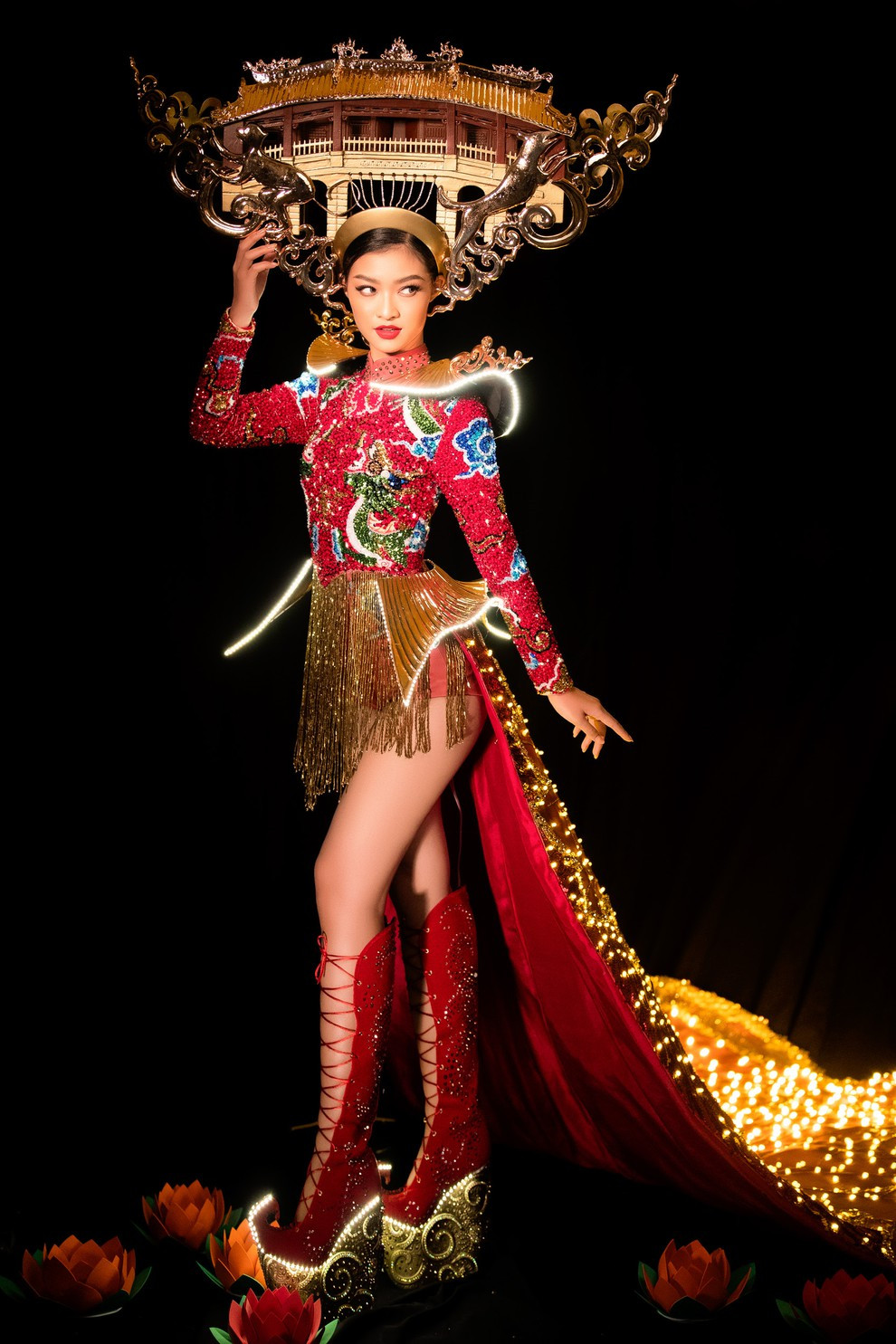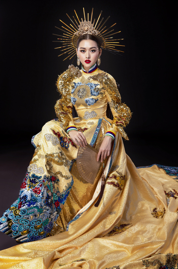Bộ quốc phục mang tên gọi "Rồng chầu mặt trời" của nhà thiết kế Hồ Hoàng Ca Dao lấy cảm hứng từ hình ảnh rồng chầu về hướng mặt trời thường thấy trong kiến trúc của người Việt. Đây cũng là đặc trưng của rồng Việt Nam so với hình ảnh rồng của các nước khác trong khu vực và trên thế giới. Nhà thiết kế Hồ Hoàng Ca Dao cũng rất tinh tế khi bộ quốc phục này được thiết kế dựa trên hình ảnh chiếc áo dài của người con gái Việt Nam kết hợp cùng những hoa văn, những dải màu mang đậm dấu ấn trang phục cung đình Huế. Đi kèm với đó là chiếc mấn đội đầu được chạm trổ tinh xảo.
