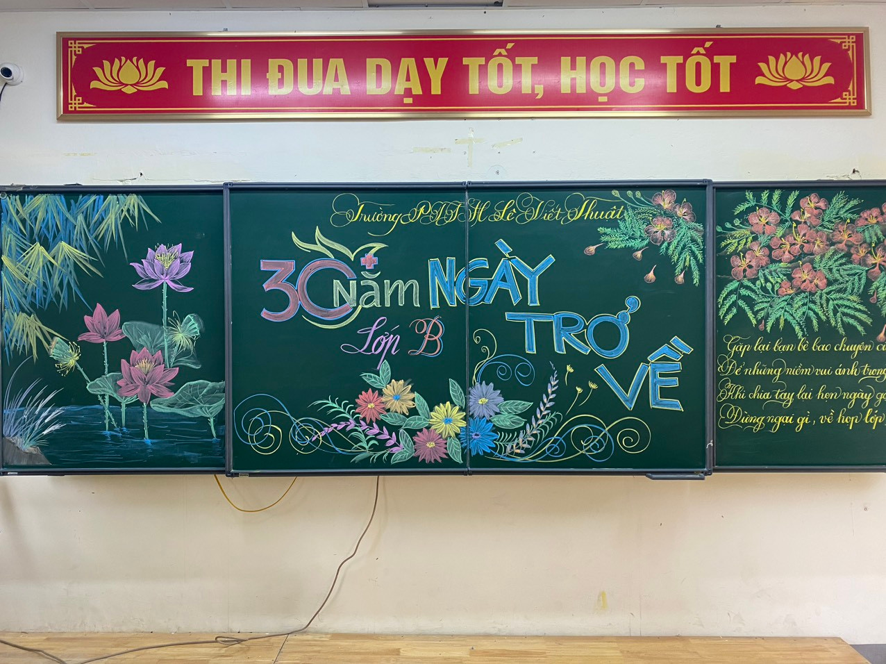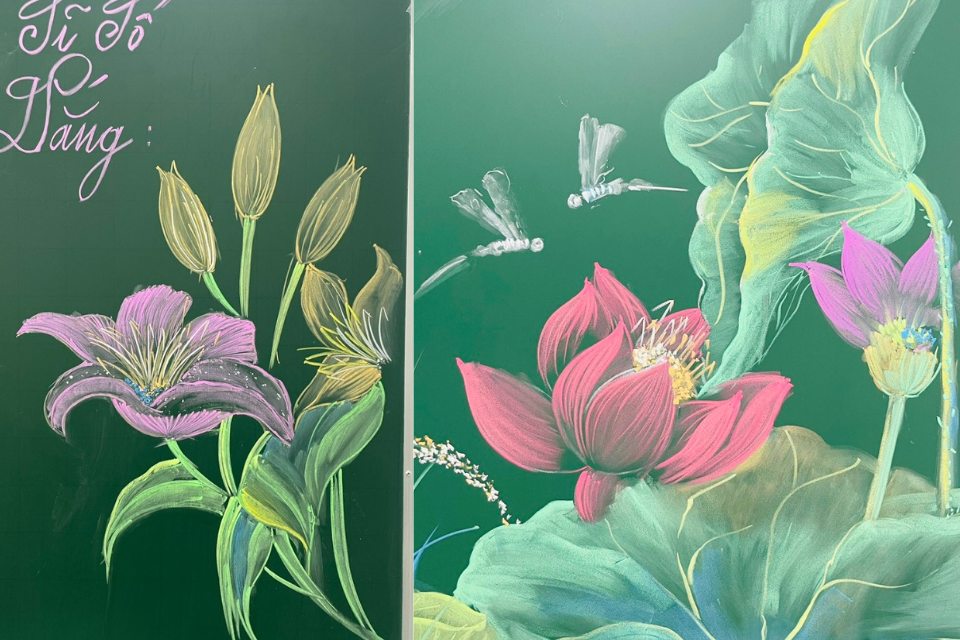 Đồng thời, thầy có niềm đam mê dùng phấn màu vẽ tranh và viết chữ trang trí lên bảng, khiến học sinh, cũng như nhiều bạn yêu thích mỹ thuật phải trầm trồ.