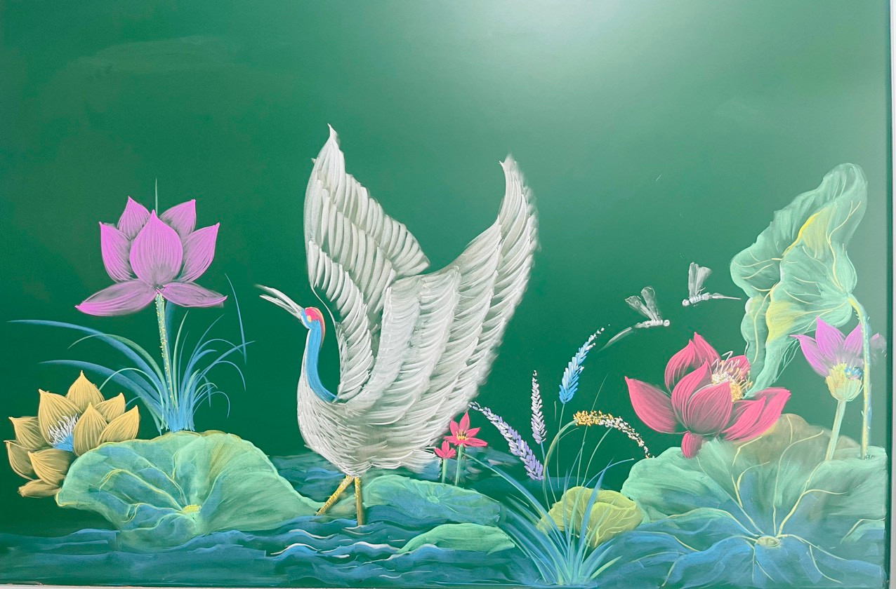 | Tác phẩm chim công thể hiện khả năng vẽ trang trí bảng của thầy Hạnh. |