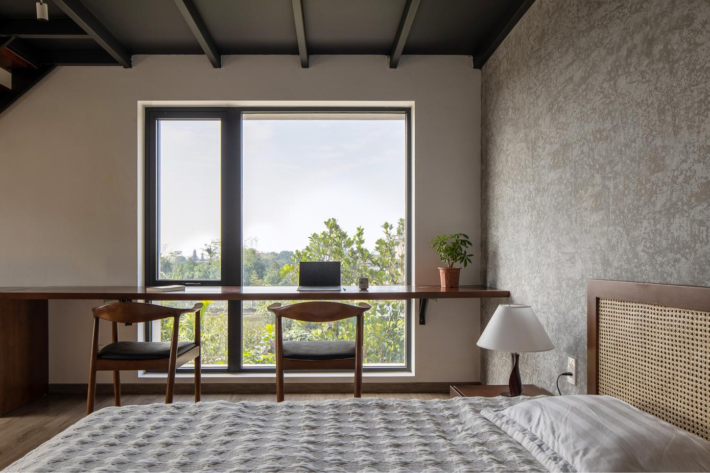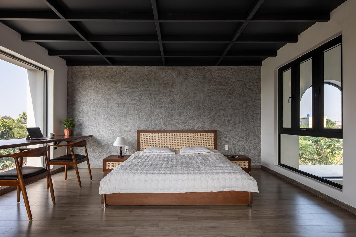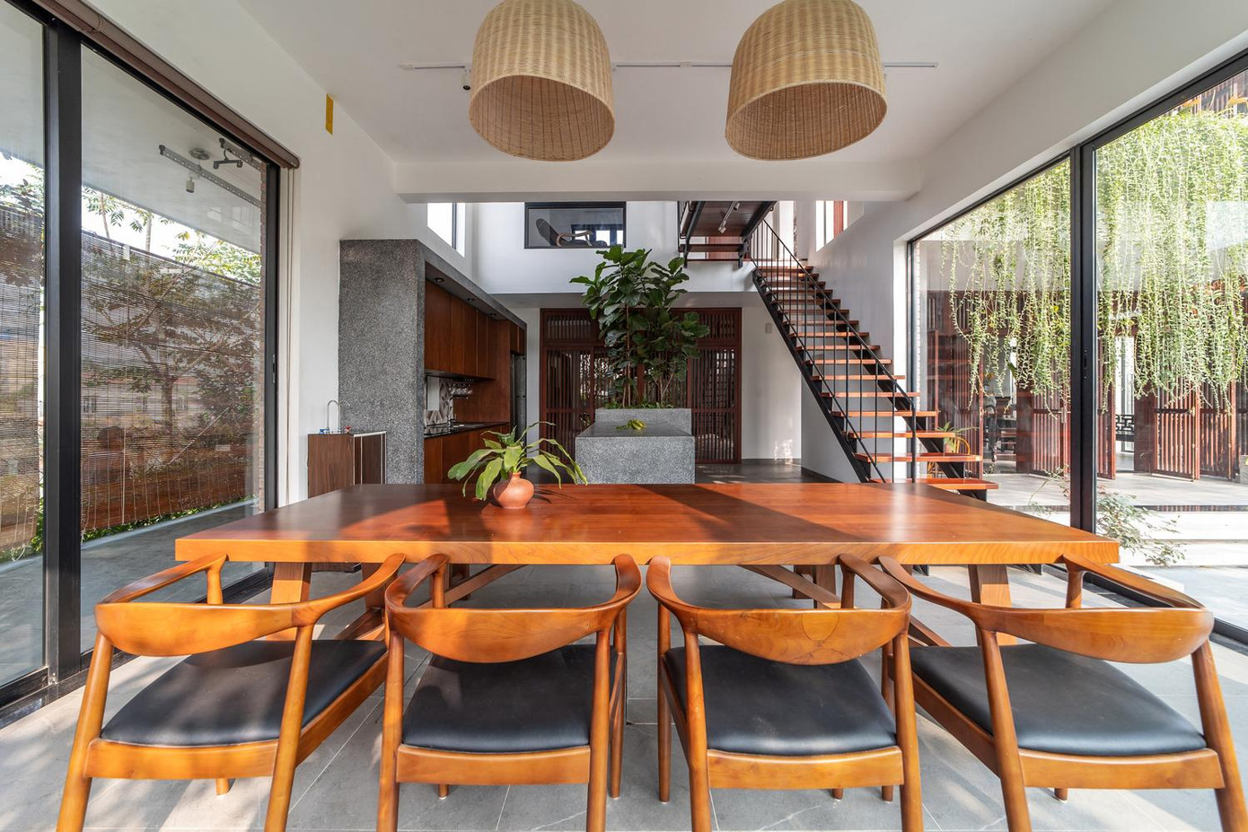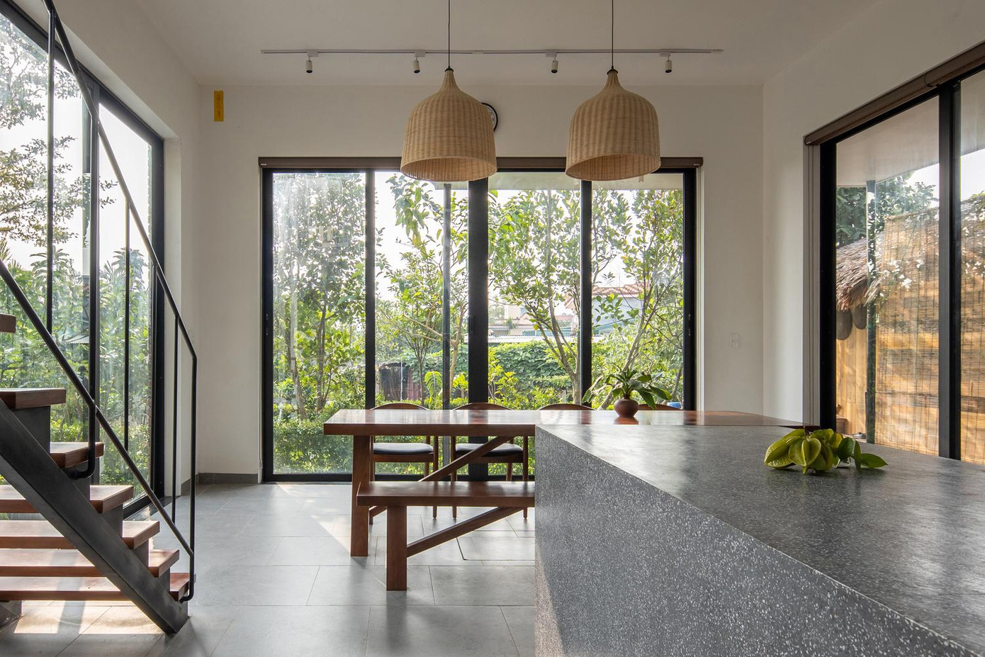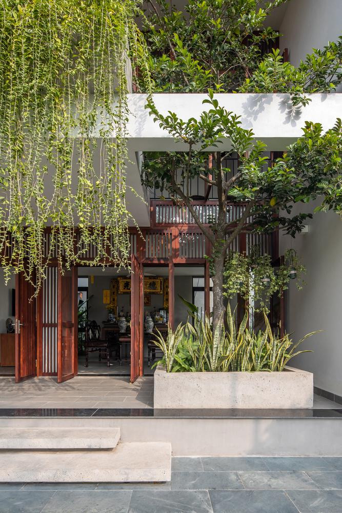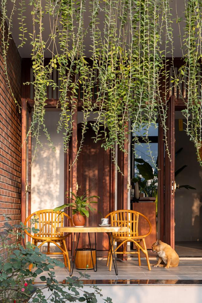| Do mặt tiền của ngôi nhà gần hướng Tây nên đội ngũ KTS đã bố trí phần hiên đóng vai trò là không gian đệm chuyển tiếp giữa trong và ngoài nhà, đồng thời là không gian giảm nhiệt cho phòng khách. Đồng thời, KTS sử dụng “rèm cây” để cản nắng và bức xạ, giúp điều hòa nhiệt độ tốt hơn mà vẫn đảm bảo thông thoáng, tầm nhìn và cũng làm dịu không gian kiến trúc, giúp con người gắn kết gần gũi với thiên nhiên. Với nhu cầu kết nối ngôi nhà với hiên và sân rộng mà vẫn đảm bảo tầm nhìn rộng, đội ngũ kiến trúc sư đã sử dụng hệ thống cửa gỗ mở quay mô phỏng hình ảnh “cửa bức bàn” truyền thống với khả năng mở tối đa cho tất cả các cửa. |