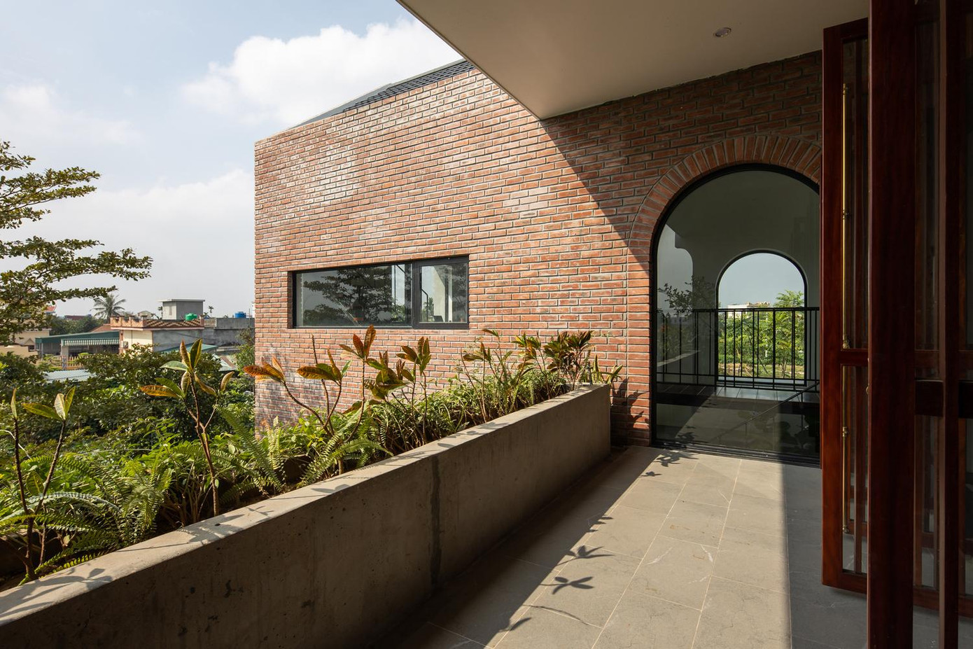 | Dãy nhà màu trắng chủ đạo nằm cùng vị trí với ngôi nhà cũ (ngôi nhà đã xuống cấp theo năm tháng). Khối gạch đỏ độc đáo với khả năng xoay dọc. Bằng cách áp dụng phép quay khối ở mặt chính, ngôi nhà đón được gió, tầm nhìn ra vườn và ao được tăng lên. Nó cũng tạo ra ấn tượng về sự tương phản của hình khối và vật liệu kiến trúc giữa hai khối nhà. |