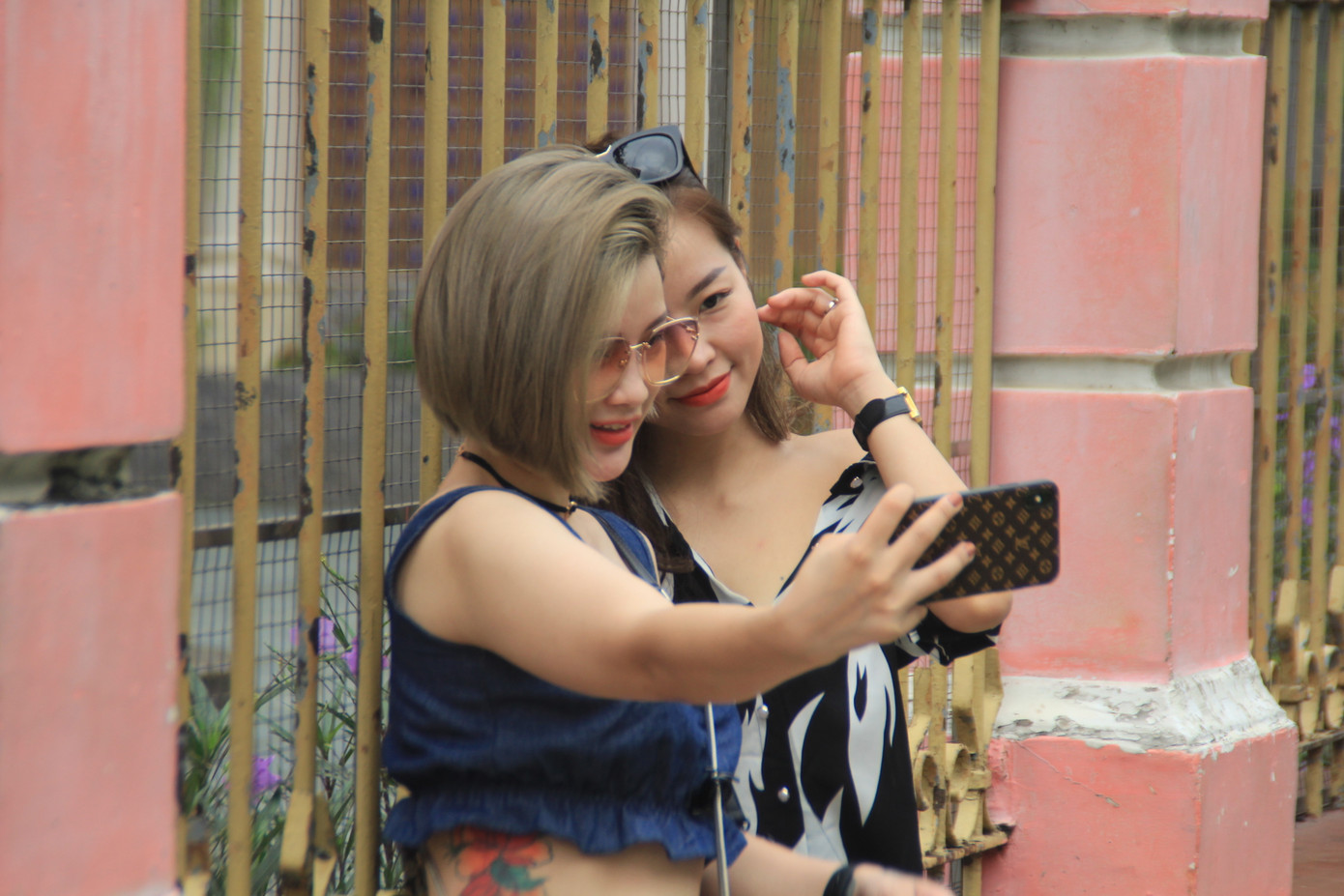Hai bạn nữ tạo dáng chụp ảnh trước nhà thờ màu hồng vào sáng 26/9