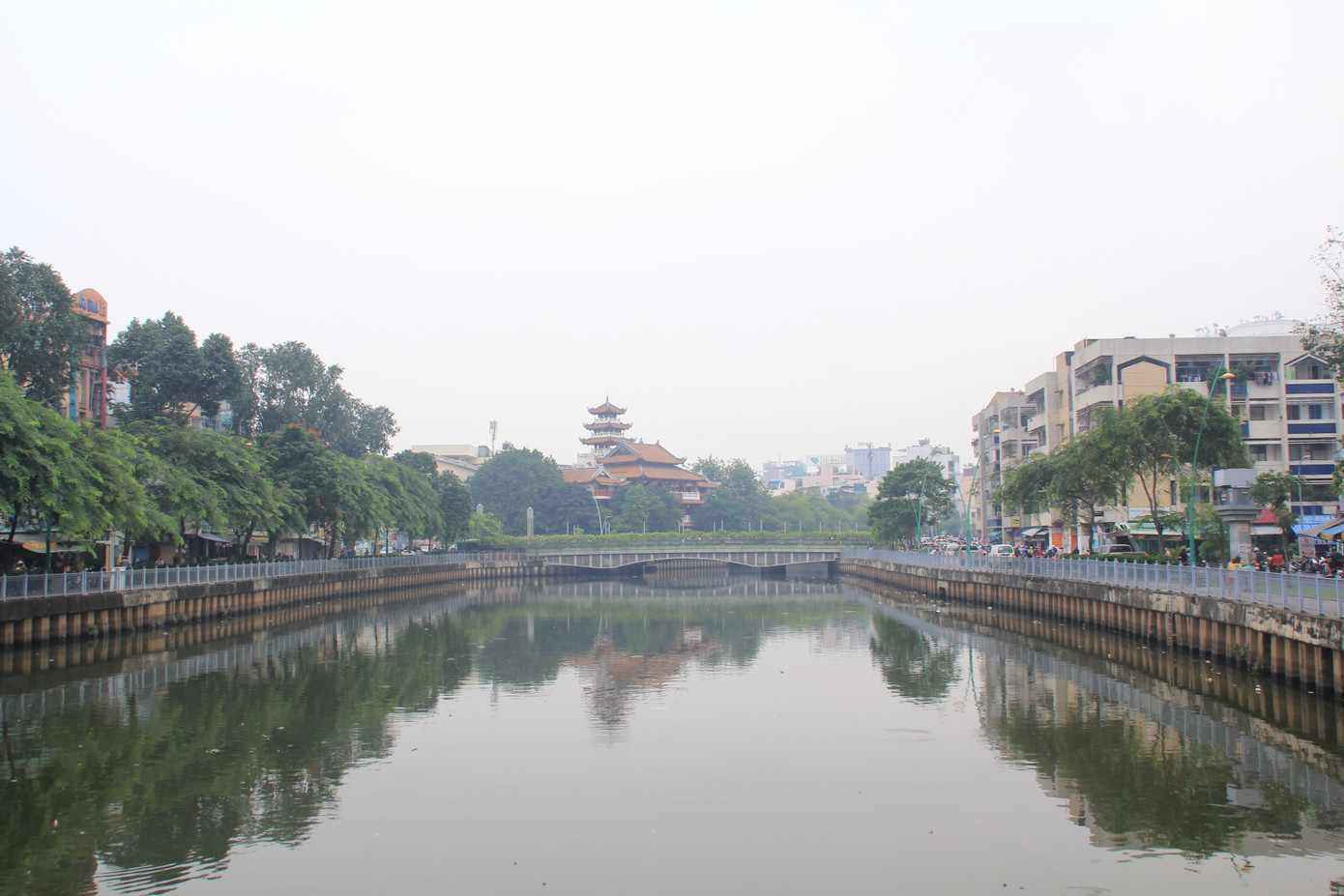 Cạnh đó, địa phương trung tâm TPHCM còn là nơi ghi dấu sự hồi sinh của những công trình xuyên thế kỷ. Con kênh Nhiêu Lộc - Thị Nghè trải dài qua các quận Bình Thạnh - quận 3 - Phú Nhuận - Tân Bình trước đây "nổi tiếng" bởi mùi hôi thối, tuy nhiên nhờ sự đầu tư, cải thiện từ phía chính quyền và sự chung tay của người dân nên giờ đây con kênh này đã được cải thiện rất nhiều. Trong ảnh, cảnh thanh bình ở con kênh trải dài qua nhiều cây cầu sắt và những ngôi chùa