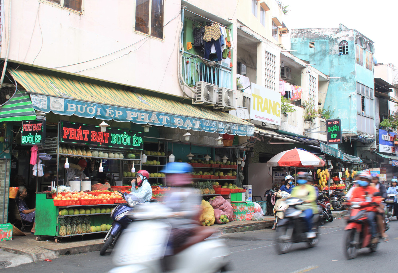 Quận 3 còn là nơi có những con phố ăn uống bình dân thu hút nhiều người tìm đến. Trong ảnh, người dân dừng mua đồ uống trên đường Nguyễn Thượng Hiền, con đường ghi dấu với nhiều cửa hàng bán bánh tráng trộn và nước ép trái cây nằm san sát nhau.
