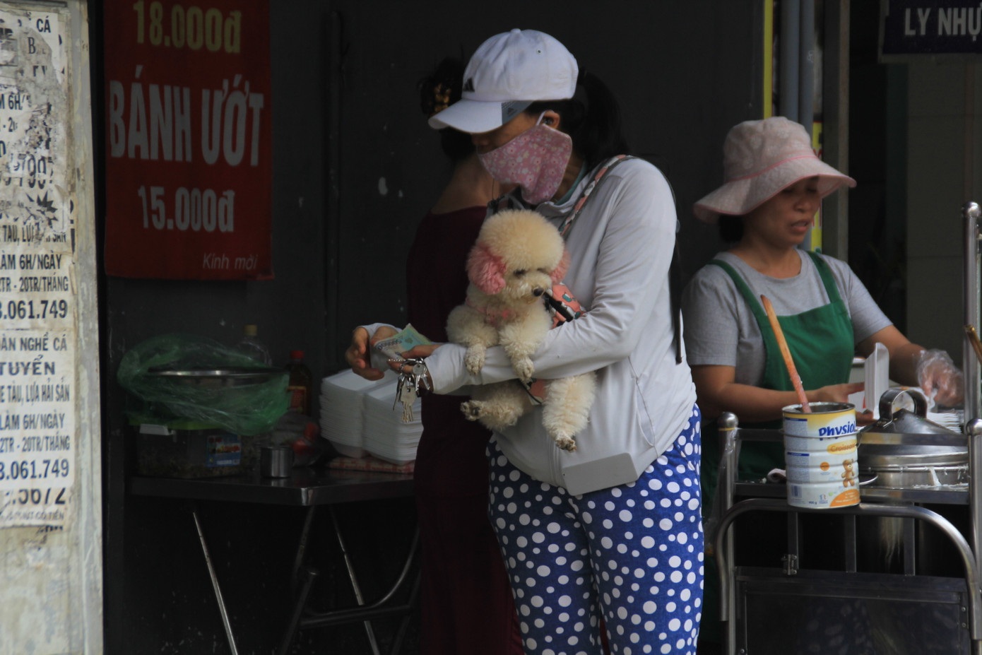 Khung ảnh nhẹ nhàng, dễ thương phóng viên bắt gặp ở một góc phố thuộc quận 3, người chủ địu theo chú cún cưng đi chợ sớm trên đường Nguyễn Thông.