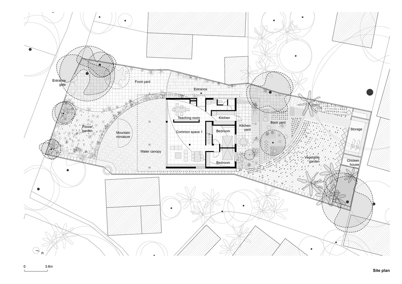 | Do đó, khu vườn sau khi cải tạo được xây dựng trên hai đường cong hình bán nguyệt giao nhau tại 2 điểm, cùng với hai tâm, tạo thành một hình vuông là dấu chân của ngôi nhà mới, ở giữa khu đất. |