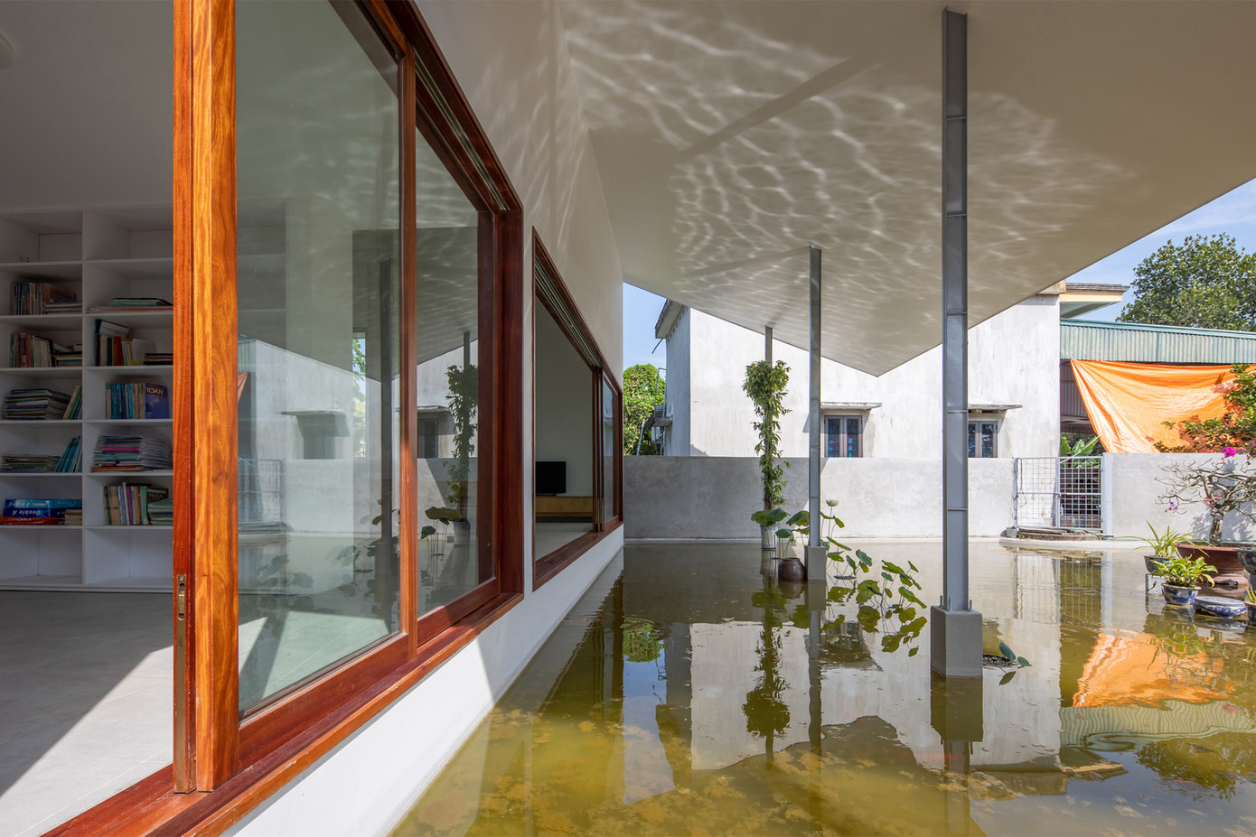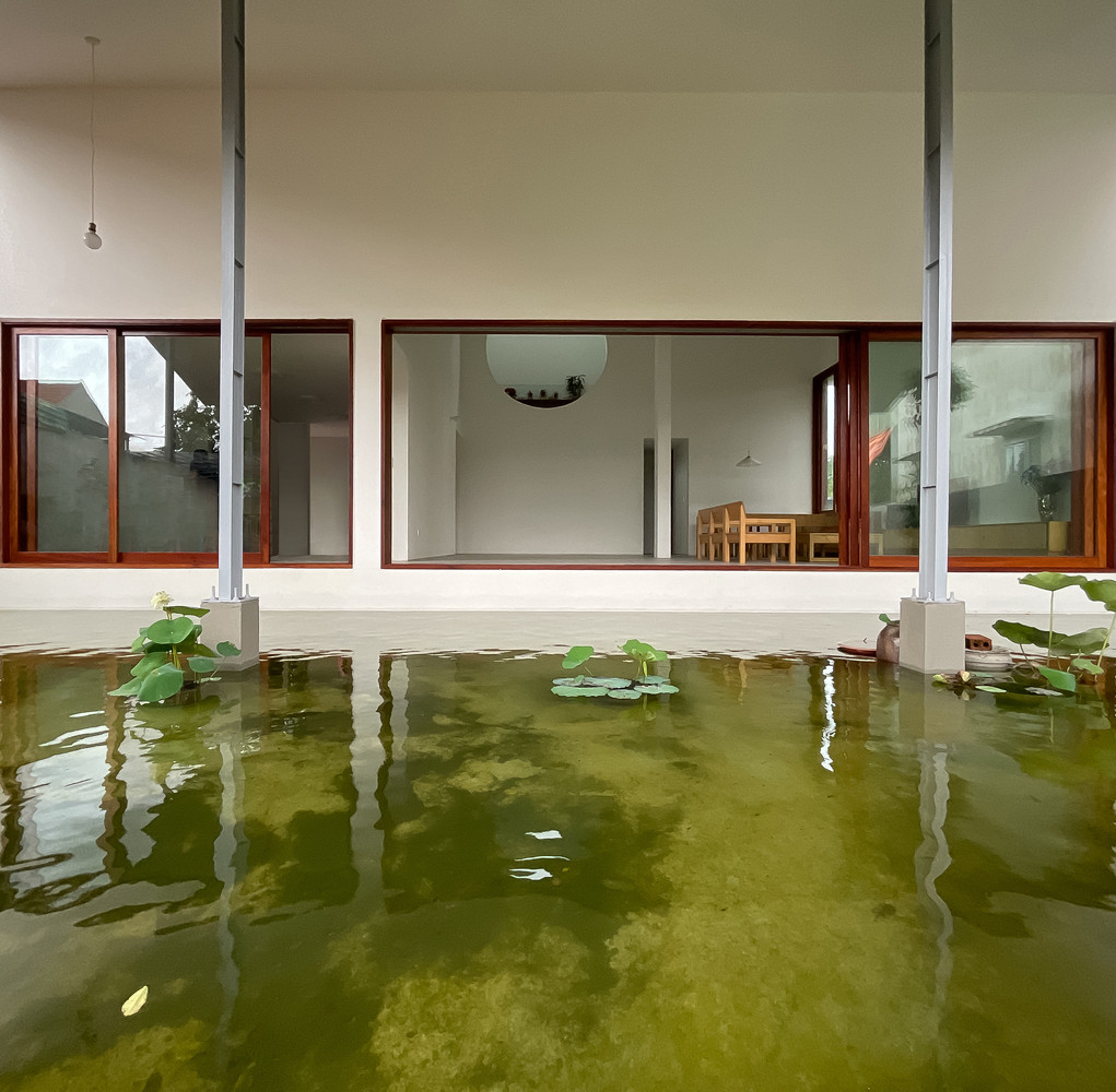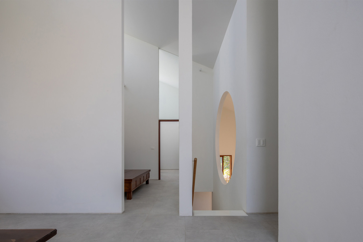| Thông qua ô cửa tròn, phòng thờ được mở rộng xuống không gian trống bên dưới, tạo thành trục không gian chính, kết nối cảnh quan nước phía trước với ánh sáng xung quanh tràn vào từ phía Bắc qua cửa sổ giếng trời. |