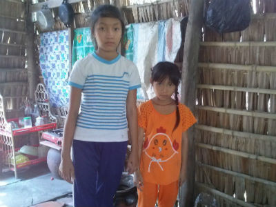 Cách nhà bà Lượng hơn 1 cây số, chúng tôi tìm đến nhà của 2 chị em bé mồ côi là em Trần Thị Thùy Mỵ, 13 tuổi đang học lớp 8 và Trần Thị Kim Vàng lớp 1 cùng xã Trường Long Tây, sống nương tựa vào ông bà nội cạnh nhà. Em Mỵ cho biết, cả hai chị em vừa đi học về và giặc bộ đồ vừa xong để mai mặc đến lớp. Căn nhà 2 chị em Mỵ đang ở được nhà nước cất nhà tình thương cách nay 5 năm. Bên trong có chiếc bàn thờ cha, xunh quanh vách lá cũ nát. Hai chị em có dáng người cao, nước da ngâm đen đang mặc trên người bộ đồ thun cũ.