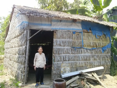 Còn đến nhà của bà Đinh Thị Hoa, 84 tuổi ở thị trấn Bảy Ngàn (Châu Thành A) đang nuôi con trai bệnh tai biến. Lúc này, bà đang nằm co ro trên chiếc võng trong nhà. Thấy khách đến, bà ngồi dậy tiếp chuyện. Theo bà Hoa, chồng mất hơn 10 năm, bà có 3 con đều có gia đình, bà sống chung với vợ chồng trai út là ông Nguyễn Văn Được đã 61 tuổi. Bà Hoa kể, cách nay 4 năm, ông Được trong lần đi làm thuê té rồi bị tai biến nằm một chỗ đến giờ.