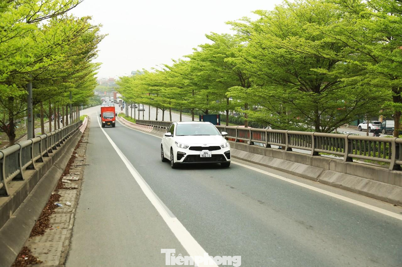 | Nếu như hồi đầu tháng 3, khi cây bàng lá nhỏ vào mùa thay lá, con đường ven sông Tô Lịch thuộc Vành đai 2 (đoạn dẫn lên đường trên cao ngã tư Láng - Cầu Giấy - Bưởi) được phủ một lớp lá vàng như khung cảnh lãng mạn mùa thu. Nay, tất cả chuyển sang mùa xanh non, tràn đầy sức sống. |