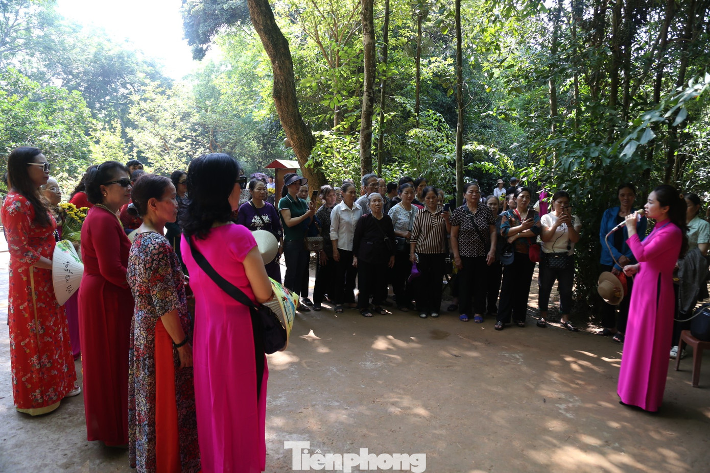 | Du khách lắng nghe những câu chuyện gắn với hiện vật ở quê Bác. |