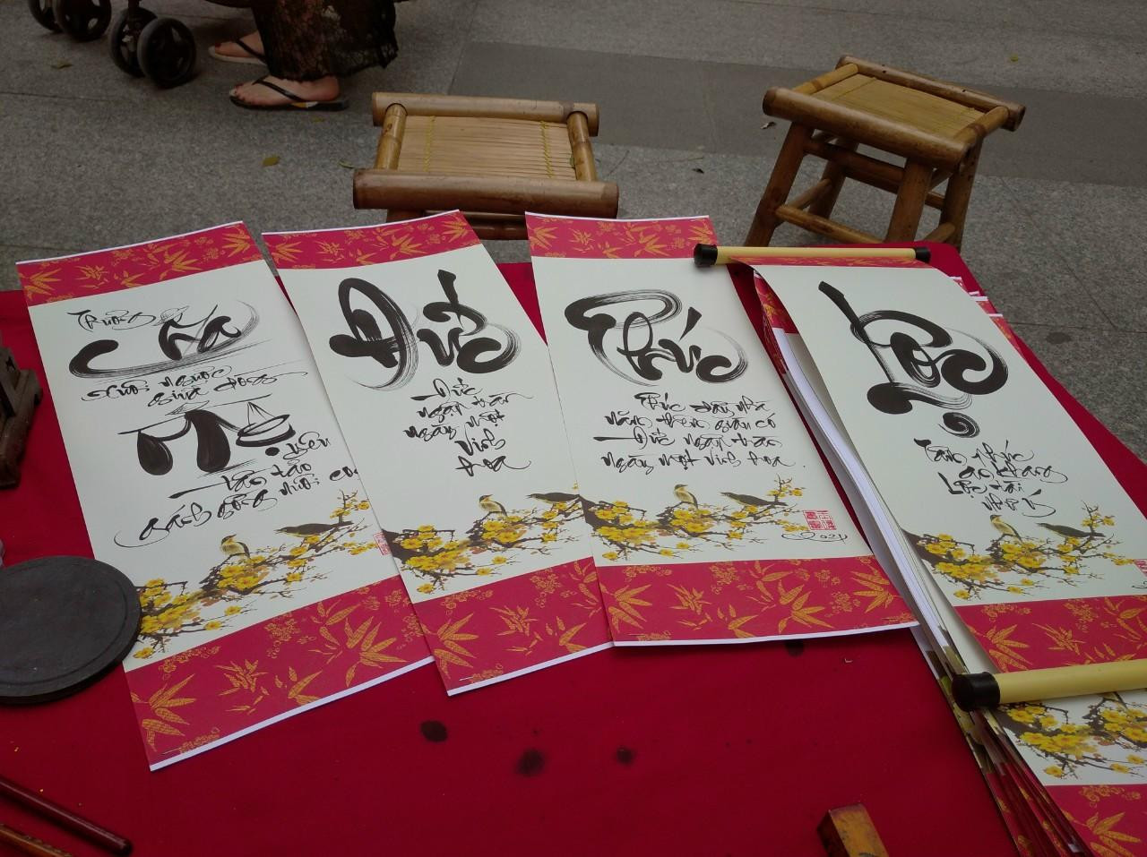 | “Về chất liệu giấy, các cụ ngày xưa dùng giấy dó, giấy điệp; còn hiện nay đa dạng hơn khi có rất nhiều loại giấy khác cũng rất phù hợp. Ngoài chữ Nho, chúng tôi còn viết những câu thơ, câu đối nghệ thuật bằng chữ Quốc ngữ nhằm đáp ứng nhu cầu thị trường đa dạng hiện nay”, Tuấn cho biết. |