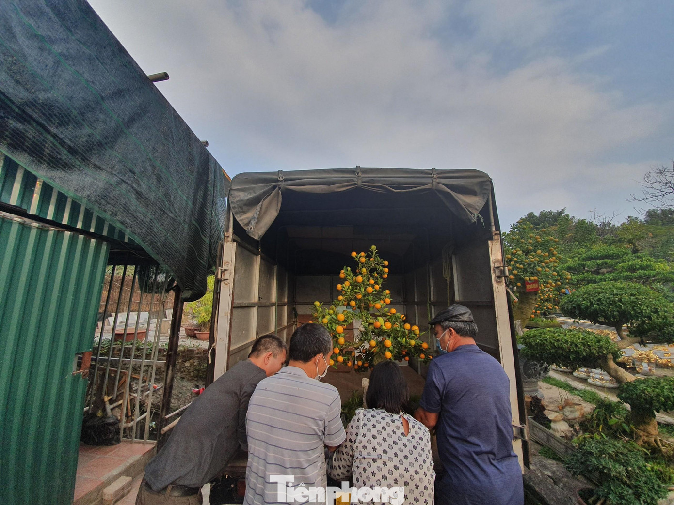 | Ông Xuân đang cùng 3 thợ khác bốc cây quất (có giá 25 triệu đồng) đưa lên xe đi trả hàng cho khách đã đặt từ hơn một tháng trước. |
