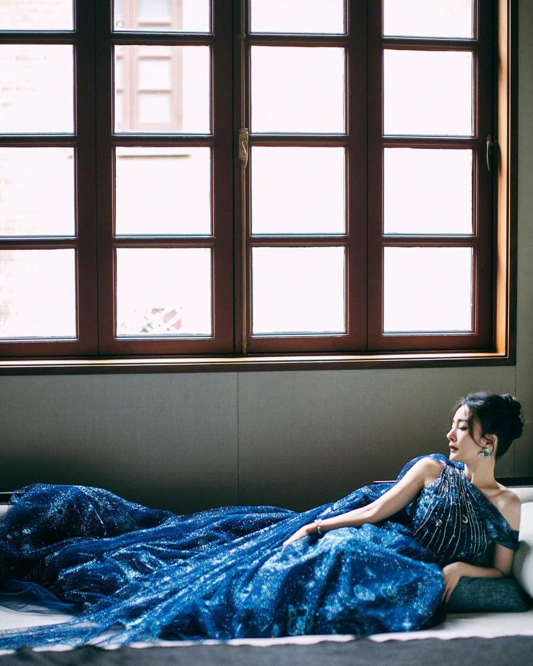 Cô mặc bộ đầm xanh lệch vai sequin lấp lánh sang trọng đài các.