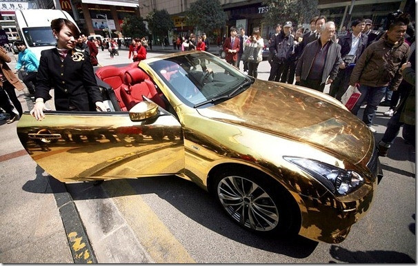 Những chiếc Ferrari, Lamborghini, Porsche, Rolls-Royce, Bentley, Infiniti, hay BMW và thậm chí là Limousines đã lung linh nay lại càng trở nên xa xỉ hơn khi khoác trên mình cả một lớp vàng sáng loáng. Hình ảnh những siêu xe bằng vàng giờ đây không còn quá xa lạ trên đường phố Trung Quốc.
