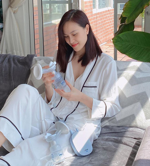 Thật không ngờ mới sinh con mà người mẫu Phương Mai đã lấy lại vóc dáng và thần sắc rạng ngời như thời con gái. Ngay cả khi ở nhà và hút sữa cho con thì Phương Mai vẫn thanh lịch hết mức trong bộ pyjama trắng tinh.