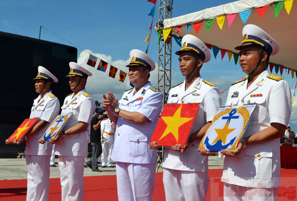 Đô đốc Nguyễn Văn Hiến, Thứ trưởng Bộ Quốc phòng, Tư lệnh Hải quân trao cờ Hải quân cho chỉ huy tàu ngầm HQ182 - Hà Nội và HQ183 - Thành phố Hồ Chí Minh.