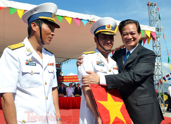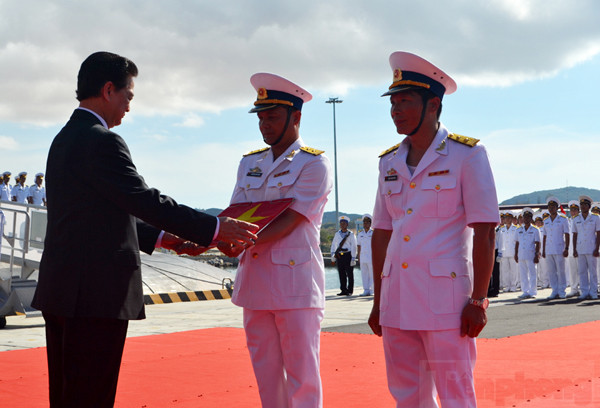 Phát biểu tại buổi lễ, Thủ tướng Nguyễn Tấn Dũng nhấn mạnh: “Chúng ta thật sự vui mừng, thật sự tự hào chứng kiến sự ra đời, chính thức đi vào hoạt động bảo vệ chủ quyền biển đảo thiêng liêng của Tổ quốc của Lữ đoàn tàu ngầm đầu tiên”. Trong ảnh: Thủ tướng Nguyễn Tấn Dũng trao Quốc kỳ cho chỉ huy Lữ đoàn Tàu ngầm 189.