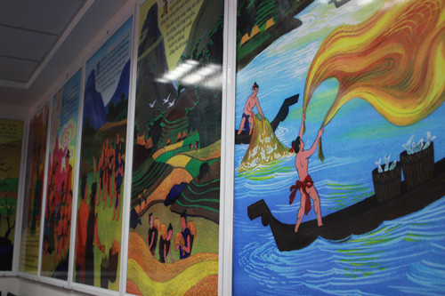 Những bức tranh mang đậm hồn quê của dân tộc được treo trang trọng trong thư viện.