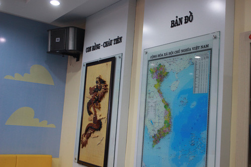 Truyền thống dân tộc "Con rồng cháu tiên" và bản đồ Việt Nam được treo trang trọng để giúp các em hiểu và yêu quý hơn lịch sử đất nước mình.