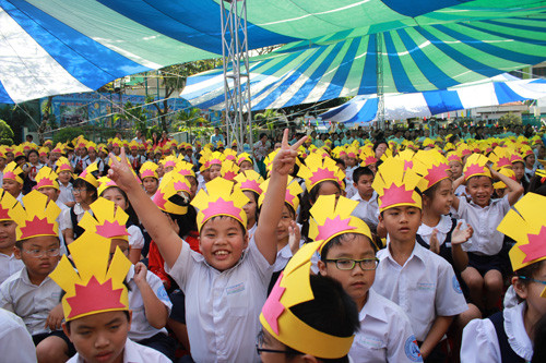 Các em học sinh tiểu học Lạc Long Quân vui mừng khi có thư viện mới.