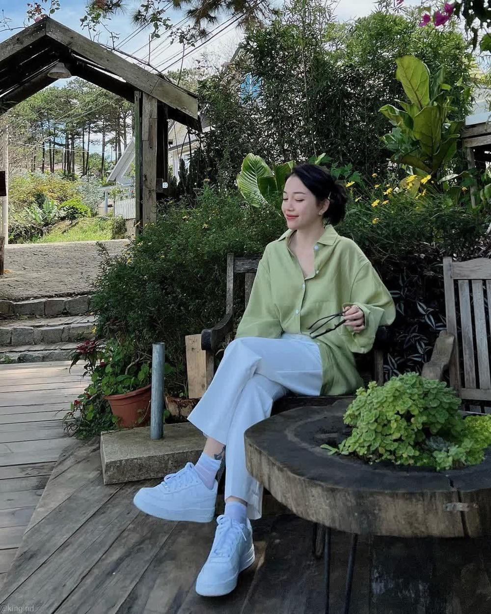 Linh Ngọc Đàm gợi ý kiểu trang phục Thu Đông đơn giản mà vẫn xinh, áo sơ mi oversized màu xanh mát mắt kết hợp cùng quần kaki và giày sneaker.