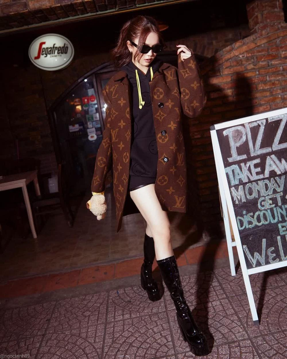 Ngọc Trinh ra phố sành điệu với áo hoodie kết hợp cùng áo khoác hàng hiệu, mang bốt da màu đen sang chảnh.