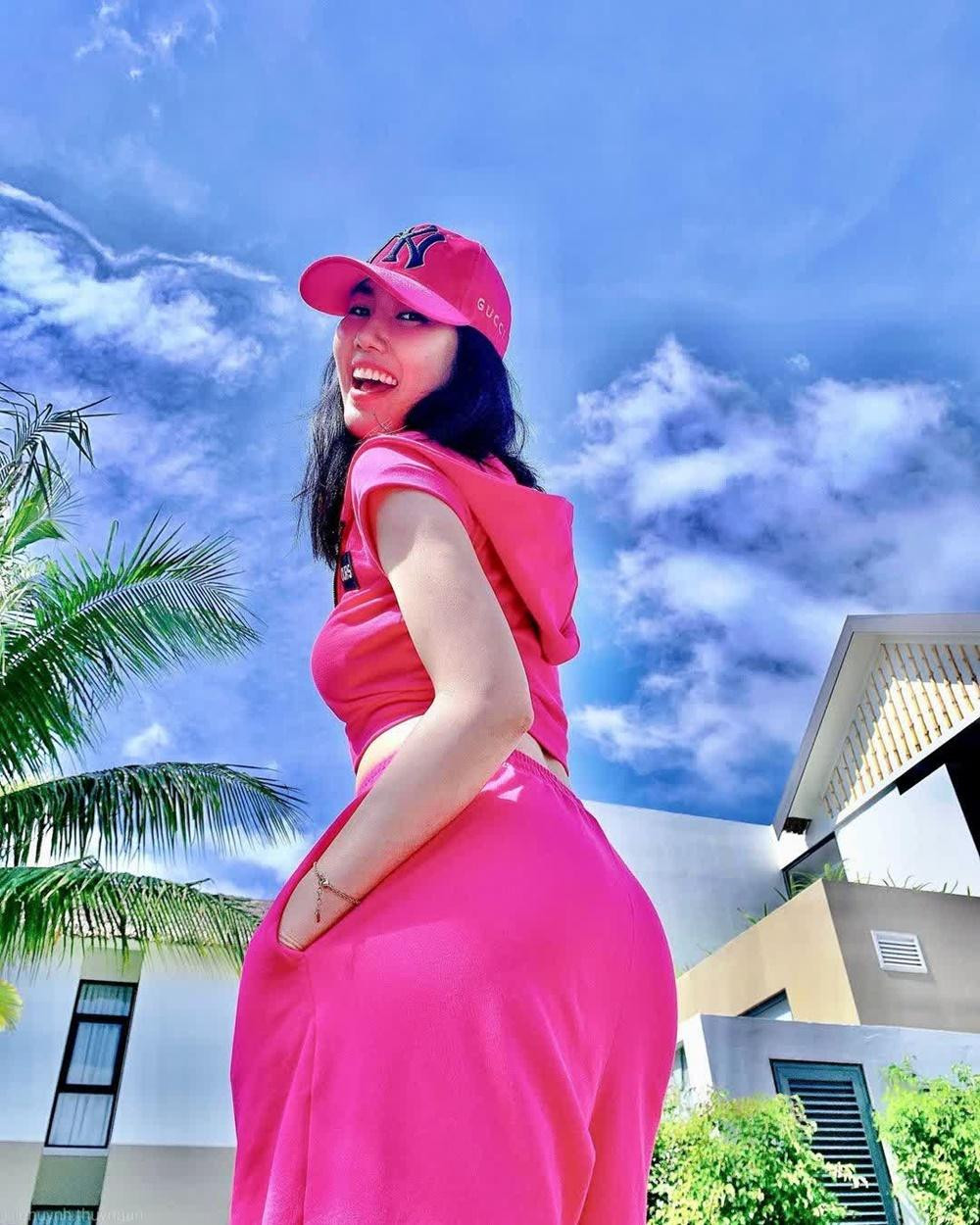 Thúy Ngân diện cả set trang phục màu hồng neon nổi bật gồm áo hoodie kiểu dáng crop-top mix cùng quần jogger và mũ lưỡi trai cá tính.