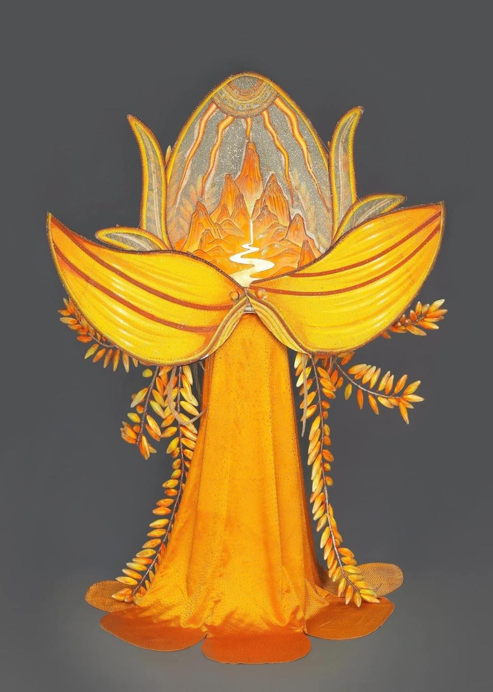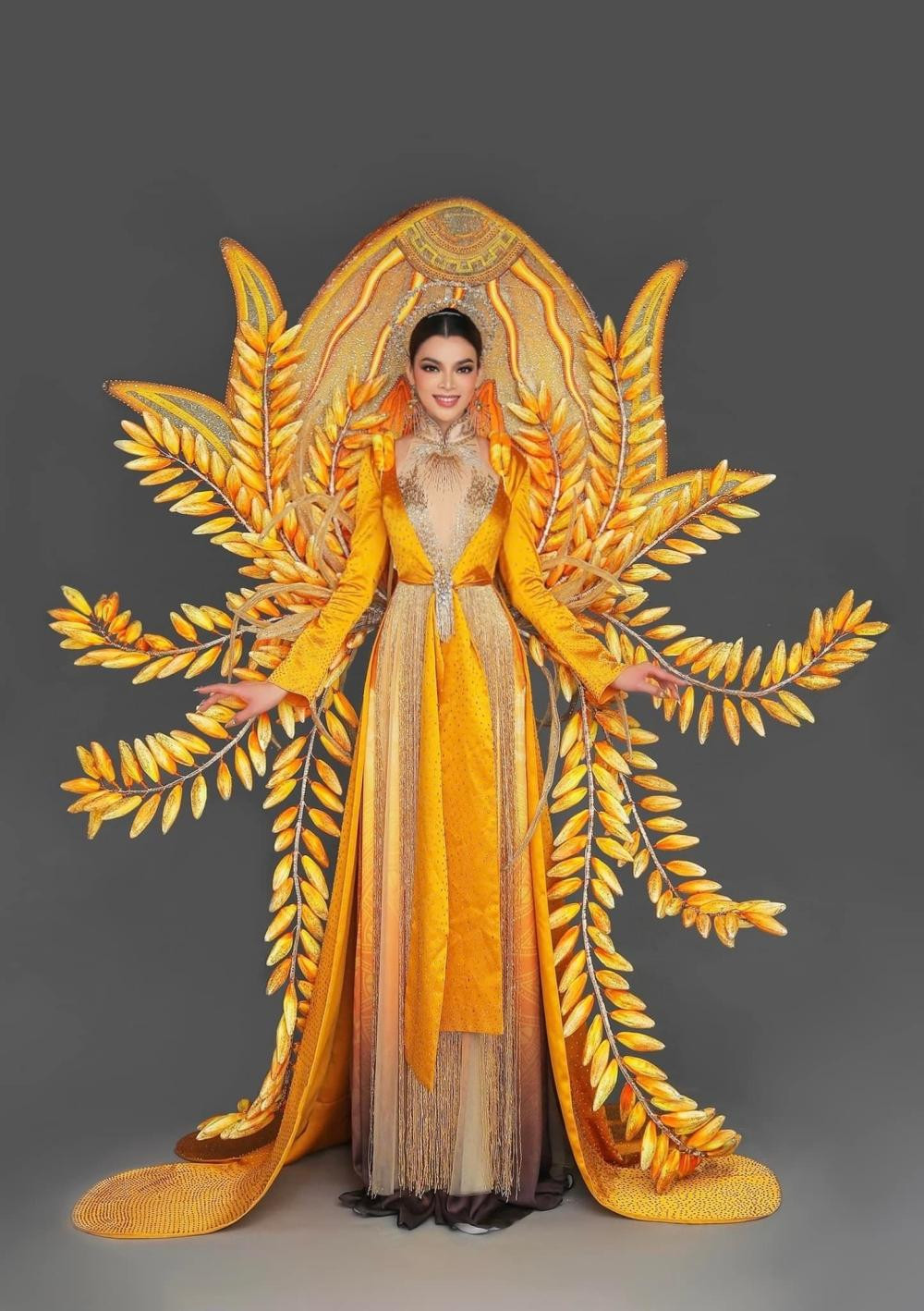 Tà áo được làm từ chất liệu lụa tơ tằm kết hợp với lưới, in hình Mặt Trời ở đuôi. Phần cổ áo có họa tiết hình chim hạc. Quần bên trong được may form rộng và phồng, sử dụng chất liệu vải lụa in 3D hoạ tiết trống đồng để trang phục trở nên đặc sắc hơn. Khoác lên bộ trang phục nặng đến 9 kg, Trân Đài sẽ phô diễn hết được vẻ đẹp của người con gái Việt Nam và hình ảnh cây lúa Việt Nam đến bạn bè quốc tế.