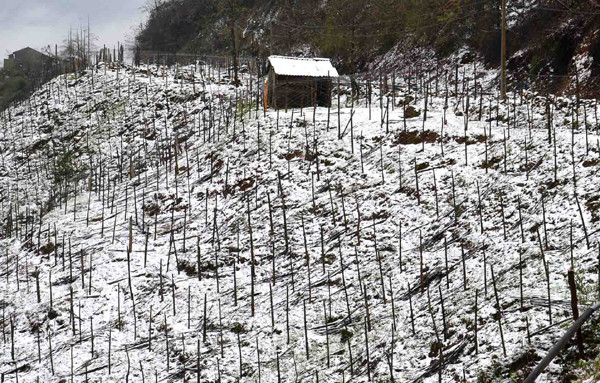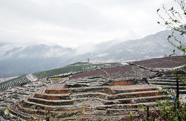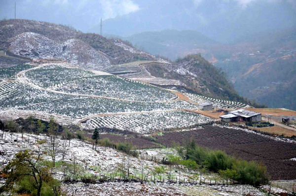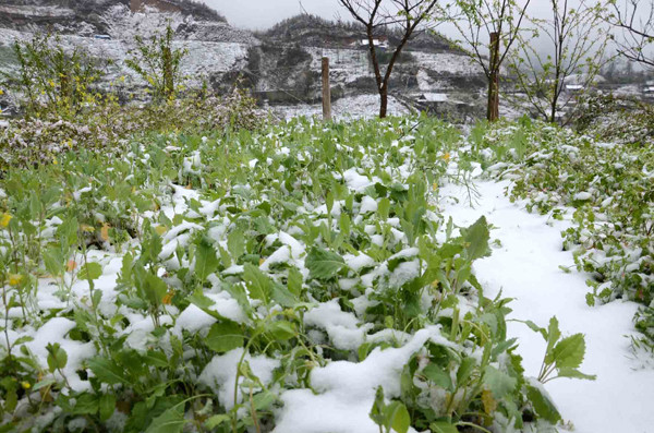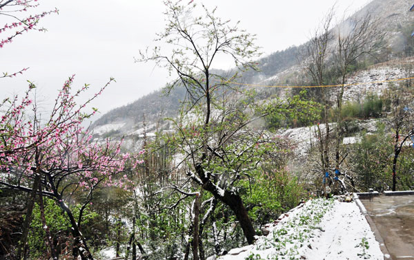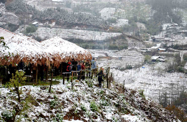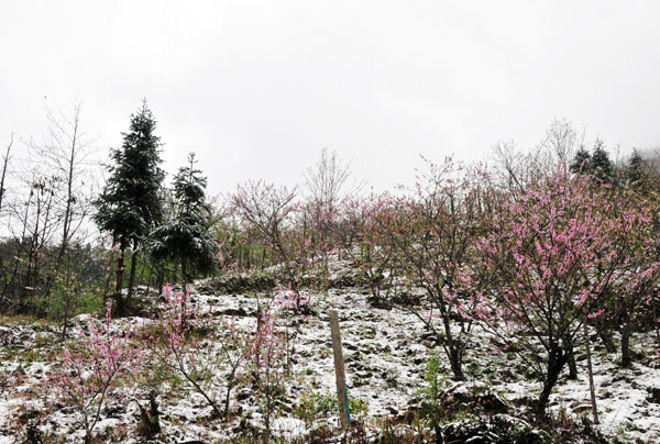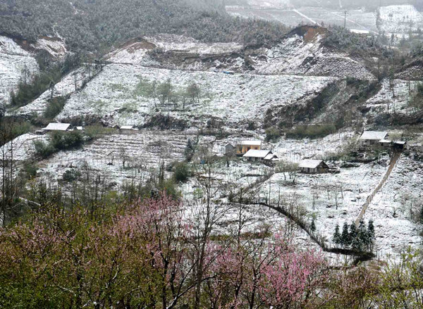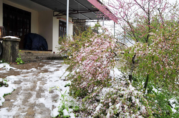 Trong mấy ngày qua ở Lào Cai, tuyết phủ trắng rừng thông, vườn hồng và các sườn núi trên đèo Ô Quy Hồ. Những cành đào thắm vẫn khoe sắc thắm trong cái lạnh tê người.