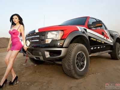 Bên chiếc xe bán tải nam tính và hâm hố, cô nàng xinh đẹp không hề bị lu mờ đi vẻ nóng bỏng của chính mình.