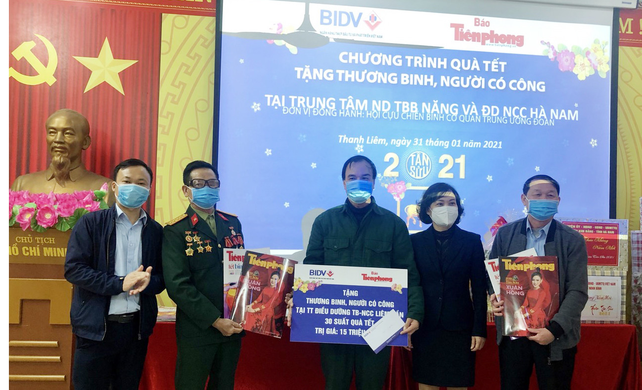 Ông Hồ Minh Phước (Phó Chủ tịch Công đoàn BIDV Nghệ An), nhà báo Trần Quang Long (Trưởng đại diện báo Tiền Phong tại Nghệ An, Hà Tĩnh) đã trao quà tết cho Thương bệnh binh nặng tại Trung tâm điều dưỡng Thương binh Nghệ An.