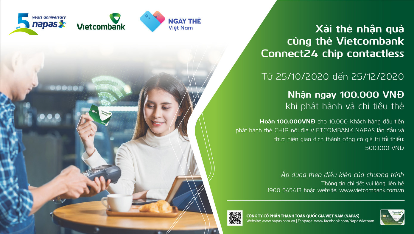 Hưởng ứng Ngày Thẻ Việt Nam 2020, Vietcombank – Ưu đãi thẻ chip Vietcombank Connect24 NAPAS, hoàn 100.000 VND cho 10.000 Khách hàng đầu tiên phát hành mới thẻ chip nội địa Vietcombank Napas và thanh toán trên POS tại ĐVCNT bất kỳ có giá trị từ 500.000 đồng trong thời gian 25/10 đến 25/12/2020. Tổng ngân sách hoàn tiền lên tới 1 tỷ đồng.