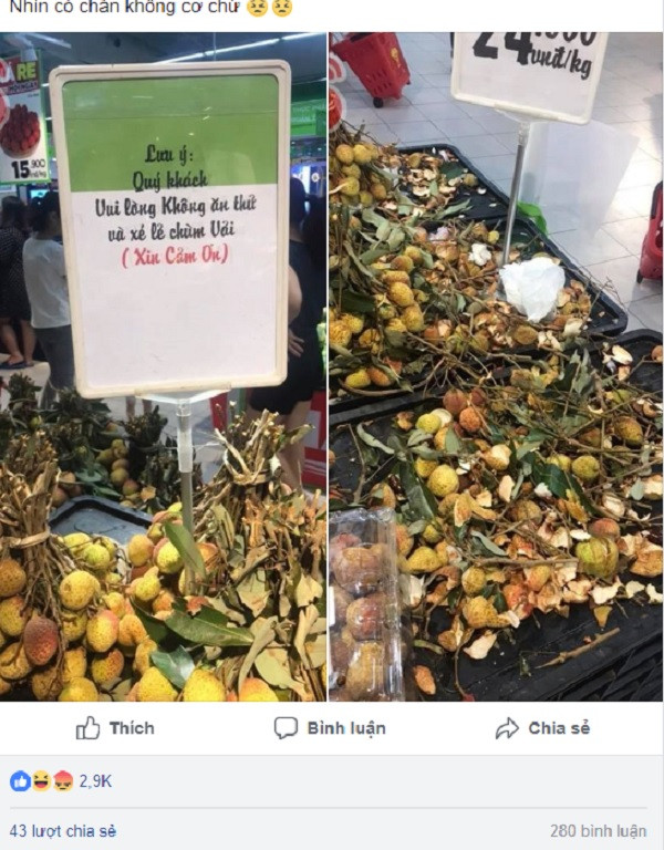 Thế nhưng, một số người ra đường đã "bỏ quên" ý thức ở nhà. Những chùm vải được niêm yết giá trong siêu thị với tấm bảng to đùng "Quý khách vui lòng không ăn thử và xé lẻ chùm vải. Xin cảm ơn!" không ngăn chặn được việc làm thiếu văn hóa của một số khách hàng có thói quen "ăn chùa, dùng đồ chùa".