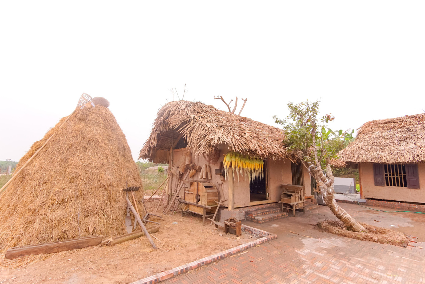 | Bên sườn nhà là cây rơm, máy quạt lúa xưa... |