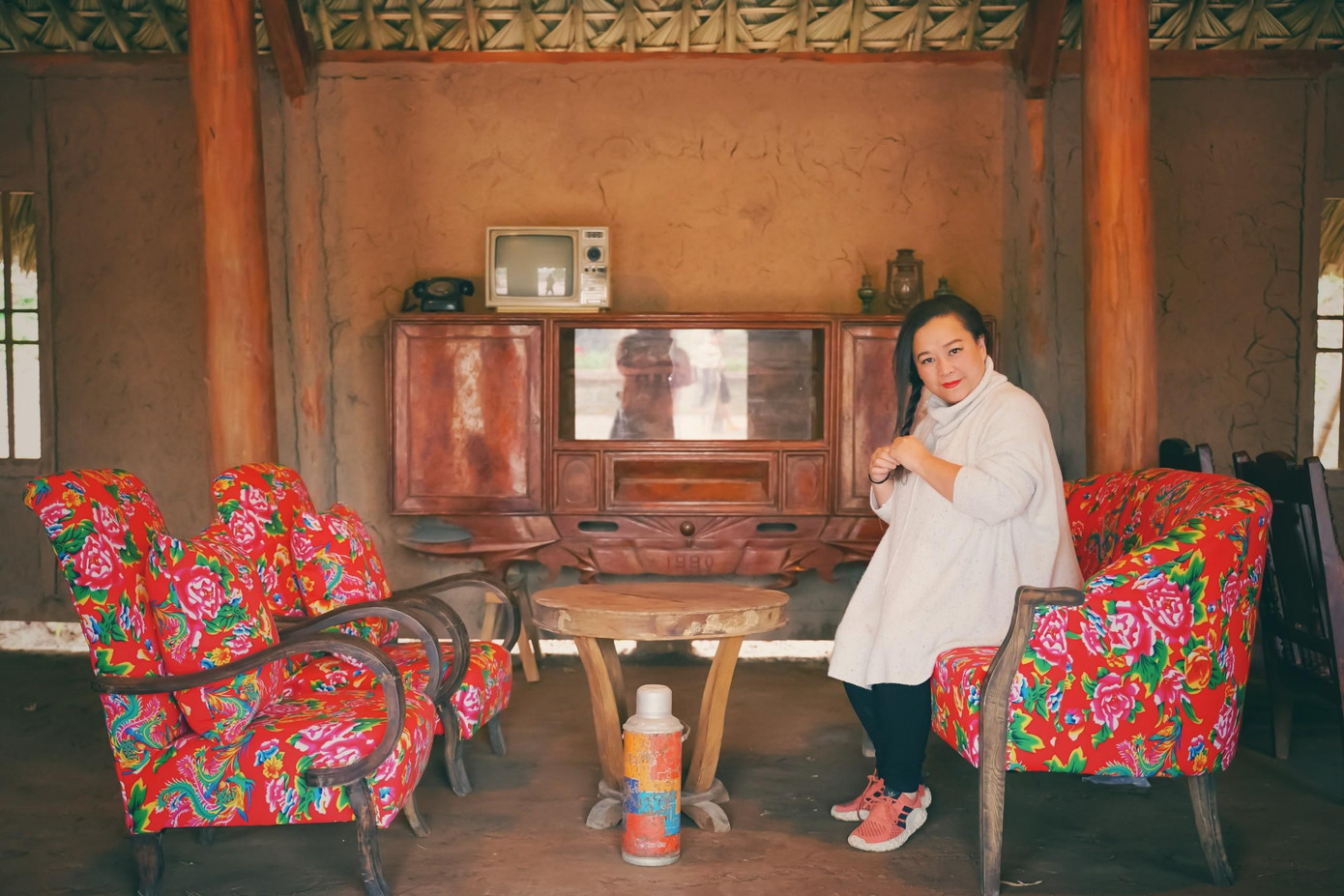 | Trong nhà bày biện đơn sơ với bộ ghế gỗ họa tiết chăn con công, ti vi đen trắng, điện thoại quay số, đèn dầu,... những đồ vật đặc trưng của các gia đình Việt ở những năm thập niên 1990 - tất cả những vật dụng này là cả tâm huyết mà chủ nhân khu du lịch này lặn lội kiếm tìm. |