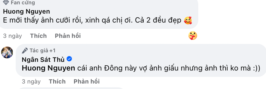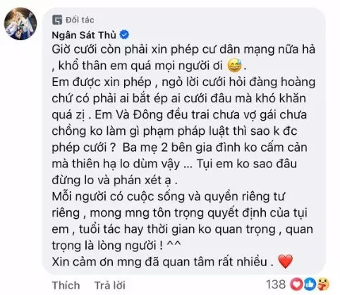 Em và Đông đều trai chưa vợ gái chưa chồng, không làm gì phạm pháp luật thì sao không được phép cưới? Ba mẹ hai bên gia đình không cấm cản mà thiên hạ lo dùm vậy… Tụi em không sao đâu đừng lo và phán xét ạ. Mỗi người có cuộc sống và quyền riêng tư riêng, mong mọi người tôn trọng quyết định của tụi em. Tuổi tác hay thời gian không quan trọng, quan trọng là lòng người! Xin cảm ơn mọi người đã quan tâm rất nhiều".