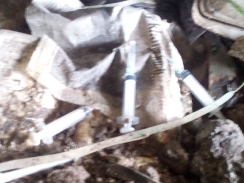 Dạo quanh một vòng ở khu vực này, PV còn phát hiện nhiều kim tiêm được các con nghiện vứt bừa bãi khắp nơi sau khi sử dụng: phía sau trạm xe buýt, trên tường rào bệnh viện, sau trạm biến áp...