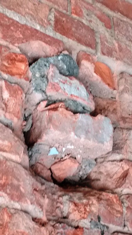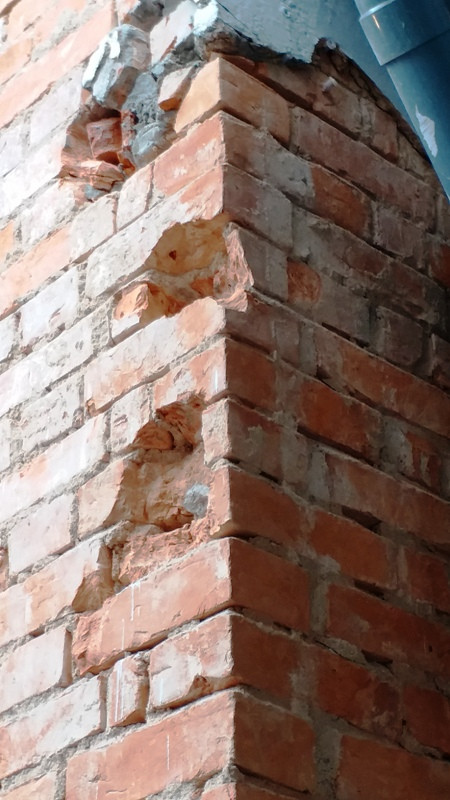 Theo quan sát của PV, các bức tường ở tầng trệt bị tẩy nhiều mảng vữa tô ở phía mặt tiền, hông bên trái và các gian bên trong. Thợ hồ còn đục nhiều lỗ lớn để thay đổi kết cấu vách, gá phủ thêm cả gạch mới lên tường cũ...